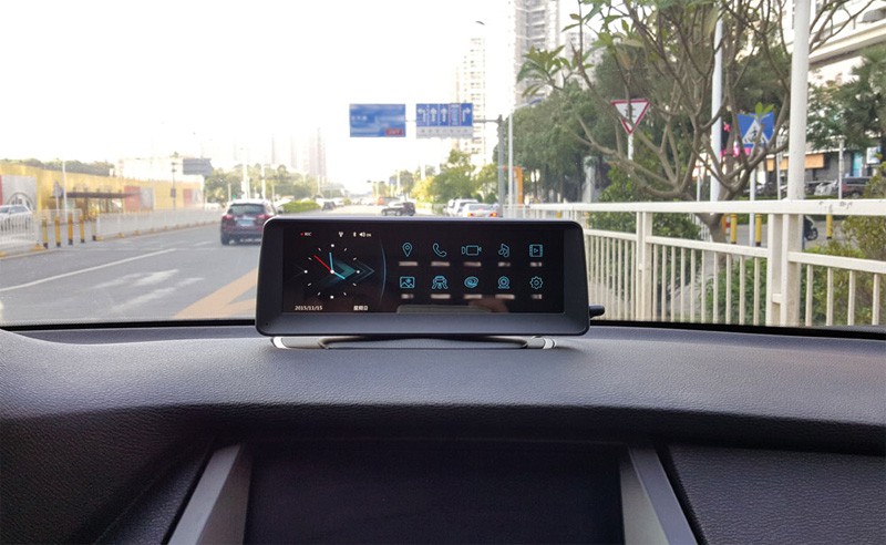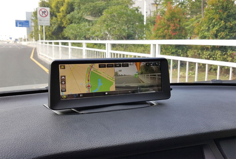 Изключително широк LCD монитор 8" с вградена FULL HD DVR камера в елегантно изпълнение, предназначен за монтаж на таблото. Мониторът е оборудван с държач за лесен монтаж на таблото, DVR камера, един видео вход (възможно е да се свърже камера за заден ход или някакъв външен източник на композитен видеосигнал), вградена GPS навигация с възможност за реално изобразяване, HD мултимедиен плейър (възможност за възпроизвеждане на файл от micro SD карта или USB), вградена Bluetooth технология за разговори и възпроизвеждане на музика, FM модулятор + AUX изход за предаване на звук към радиото.