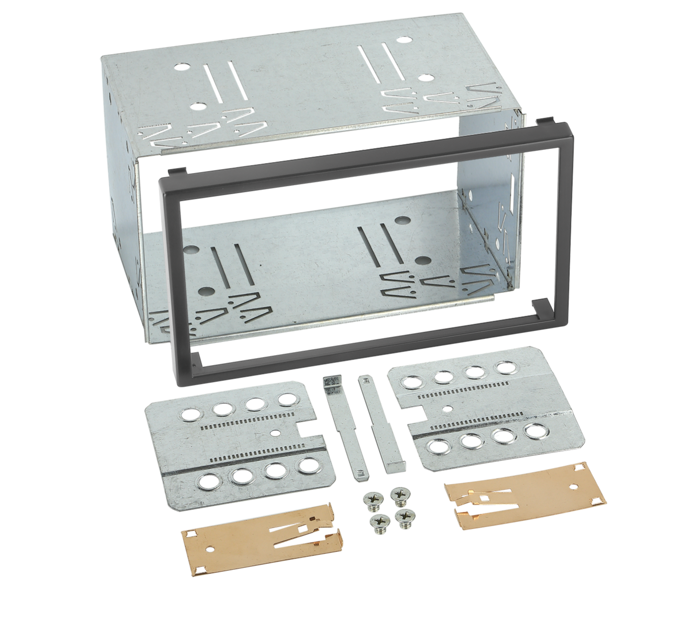 - Комплектът съдържа: вилички (2 бр.), пластмасова дистанционна рамка, странични скоби за монтаж на автомобилното радио, метална рамка.