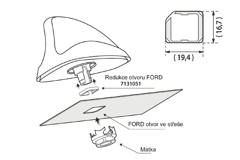 - Предназначено за автомобили с антена, разположена в задната част на покрива с отвор 19,4 x 16,7 mm.