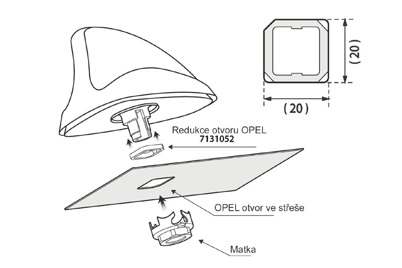 Предназначено за автомобили с антена, разположена в задната част на покрива с отвор 20 x 20 mm.