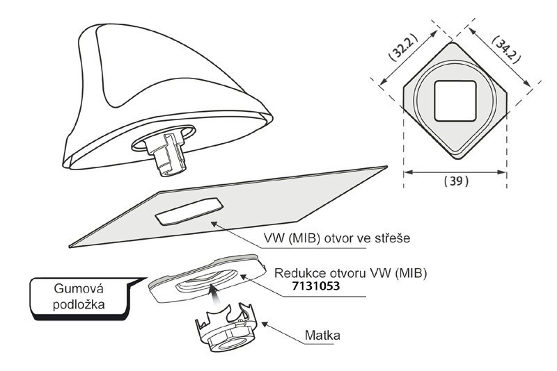 Предназначено за автомобили с антена, разположена в задната част на покрива с отвор 32,2 x 34,2 x дълбочина 39 mm.