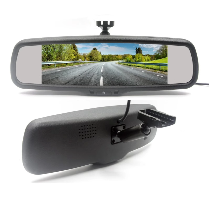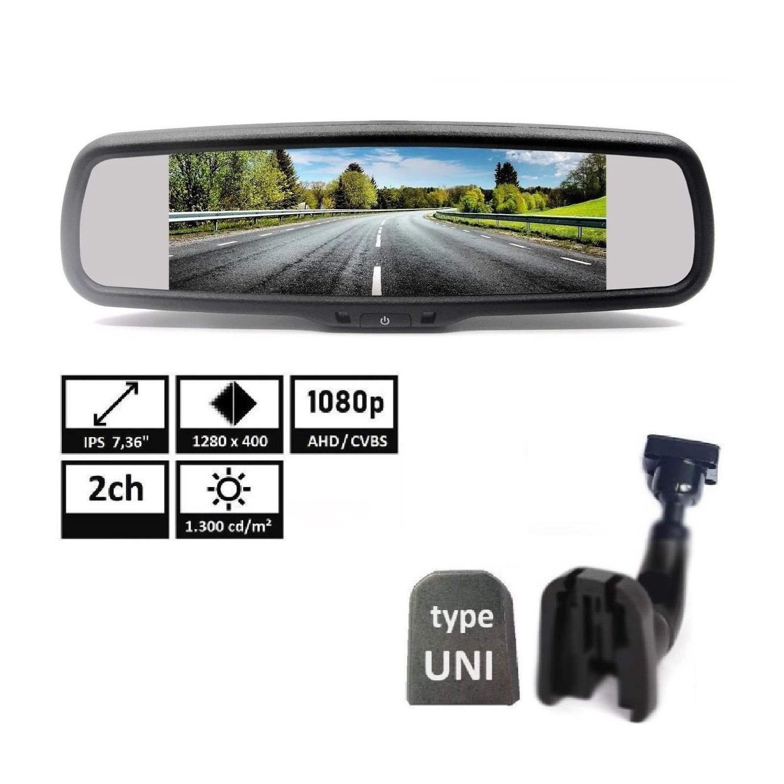 Универсален монитор s IPS дисплеем с размер 7\" интегриран в задното огледало, за показване на сигнал от 2 камери. Огледалото с държач е предназначено за ванове без задно огледало (например необходимо е да се залепи на стъклото метална монтажна планка), или за автомобили Ford, Hyundai/Kia, Nissan, Toyota, Mazda и други, които имат същата планка на стъклото още от завода. Мониторът поддържа камери с CVBS аналогов и AHD сигнал.