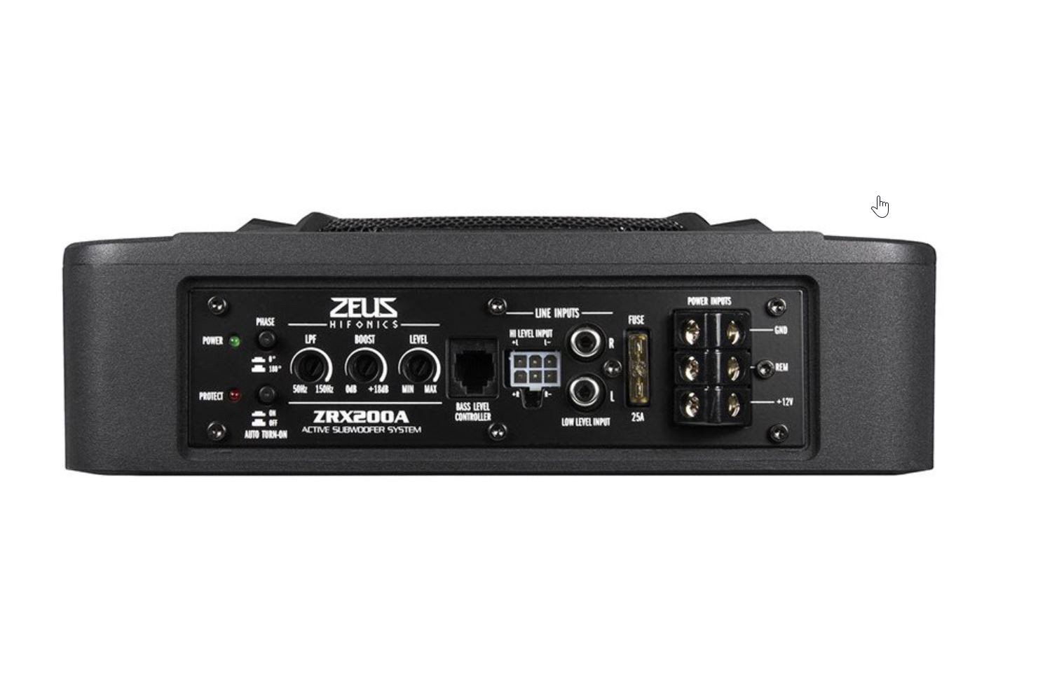 Благодарение на специално разработения корпус AIR-COMPOUND активният подседалков субуфер ZEUS ZRX200A свири с около половин октава по-ниско в сравнение със сходни големи субуфери и заслужава позицията в серията ZEUS. Върхът на системата ZEUS ZRX се крие вътре в корпус от лято под налягане. Комбинацията от две допълнителни камери манипулира въздуха и съответно физиката толкова умело, че в резултат нивото на баса е еквивалентно на това от по-голям корпус на говорителя. Ефектът е впечатляващ - практически увеличената ефективност на говорителя благодарение на този трик дава на ZRX200A значително по-ниска настройка на честотата. По-дълбоките и по-чисти басове не са проблем за компактен субуфер. С огромна мощност 150 W RMS той лесно задвижва специално разработения плосък субуфер с алуминиева мембрана и 36mm голяма говорна бобина. Благодарение на масивния корпус от лят алуминий ZRX200A предлага още в момента на изваждане от кутията много солидност и здравина, и е приятно стилизиран.
