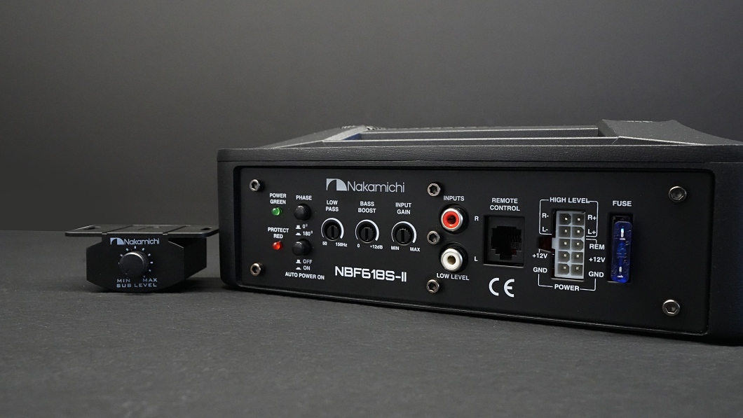 NBF618S е най-малкият активен субуфер под седалка от Nakamichi, но малък не означава тих. Благодарение на мощност 100 W RMS, захранваща 6 x 8" басов говорител, субуферът съчетава компактни размери с достатъчна мощност. Той осигурява моментално увеличаване на ниските честоти от фабричната източникова единица или следпродажбено автомобилно радио в надстандартно качество. Nakamichi NBF618S е проектиран така, че да може лесно да бъде монтиран под почти всяка седалка. Височината от 72 mm гарантира удобен монтаж в повечето превозни средства. Разбира се има контролен панел с възможност за настройка на входната чувствителност, нискочестотна пропускателна част (dolní pásmová propust), Bass boost или Subsonic филтър. Субуферът може да бъде свързан чрез RCA и високонеравневи входове, а в комплекта ще намерите и дистанционно управление за лесна настройка на нивото.