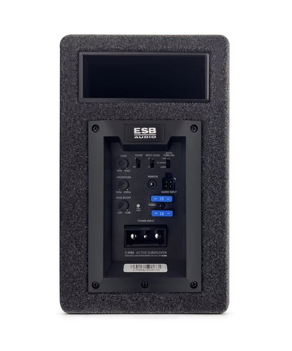 Моделната серия 3000 (Tremila) от ESB бе разработена и сглобена с голям ангажимент към изследване на материали и технически решения от най-високо ниво. В офертата на серията Tremila ще намерите широко портфолио от продукти, които се отличават с много качествен звук, безупречно изпълнение и използване на най-съвременни технологии. Същото важи и за субуферите от серията Tremila — можете да разчитате на отлична звукова празина и множество иновации. Активният субуфер от тази серия разполага с 6" говорител с хартиен конус, подсилен с въглеродни влакна, здрав феритов магнит и преди всичко интегриран цифров усилвател с мощност 250 W RMS. Компактният басрефлексен корпус с дебелина само 15 cm осигурява мощни баси с характерното за ESB Audio качество. В корпуса е включен панел за управление с plug & play конектор за лесно отделяне на субуфера. На панела ще намерите също управление на нивото (gain), нискочестотен филтър, bass boost, а оборудването се допълва от настройка на фазата. Разбира се, налично е автоматично включване, а в комплекта ще намерите и дистанционно управление.