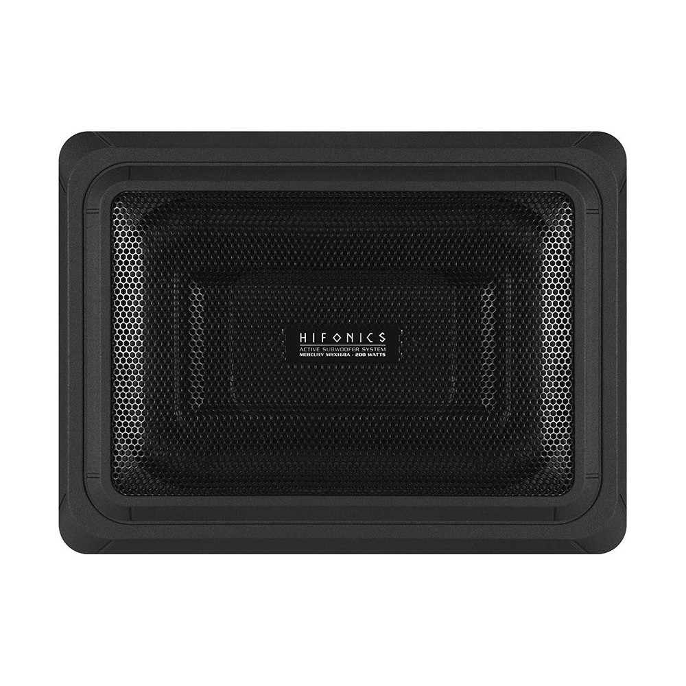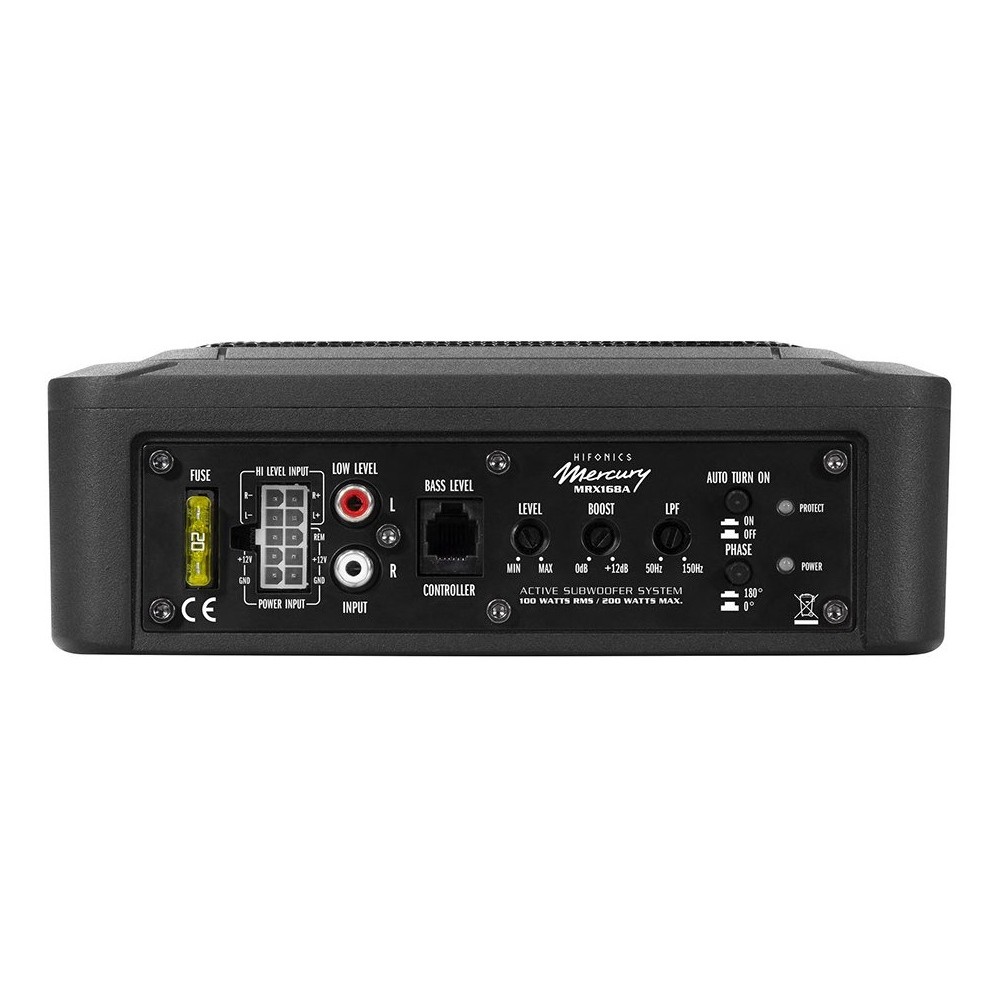 Активният субуфър под седалката MERCURY MRX168A с размери 26 x 19,5 cm надминава конвенционалните субуфър системи от този тип с няколко сантиметра. Това, което малката активна система произвежда в областта на могъщите басове, със сигурност ще впечатли всеки слушател. В толкова малки кутии налягането по време на работа е много високо; търговските мембрани биха били унищожени. Поради тази причина MRX168A използва специална алуминиева овална мембрана, която издържа и на най-високите налягания. Не е малък и използваният усилвател клас A/B. С 100 вата RMS той перфектно захранва алуминиевия конусен ууфер чрез 36 mm подвижна бобина. Благодарение на 10-пиновия конектор, устойчив на късо съединение, активната система може при необходимост да бъде бързо и лесно извадена.