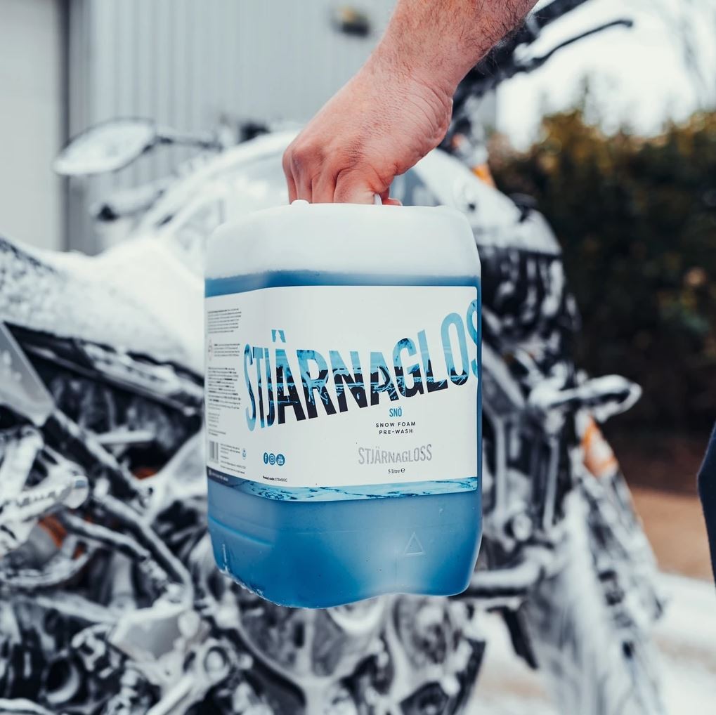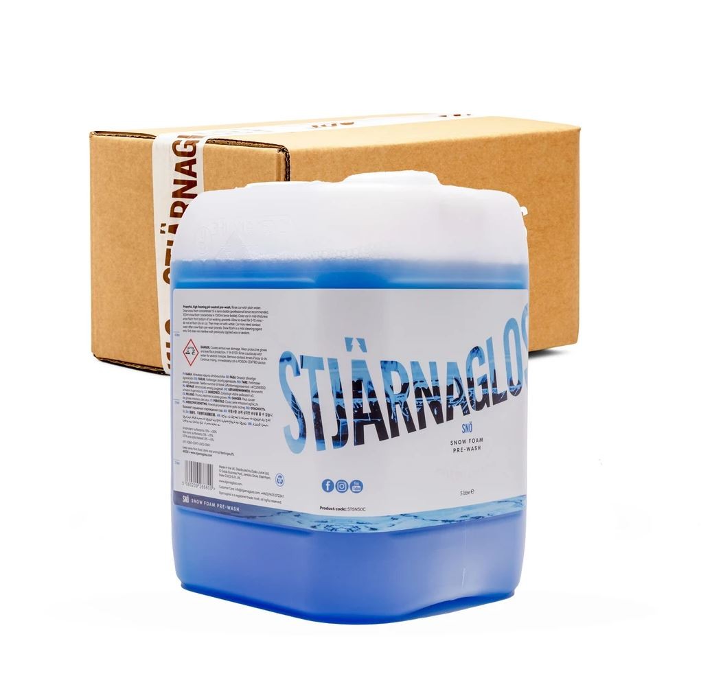 Stjärnagloss Snö е pH неутрална, много концентрирана активна пяна. След нанасяне образува гъста пяна и осигурява отлична прилепливост и почистващи свойства. Снежната пяна Stjärnagloss Snö е проектирана да премахва обичайните замърсявания от лака и така да подготви повърхността за безопасно контактно миене на автомобила. В комбинация с пянообразуващ накрайник получавате супер концентрирана формула на пяната, максимална плътност и прилепливост. За постигане на най-добри резултати нанасяйте с професионален пянообразуващ накрайник и с високонапорна помпа, способна да развие налягане 130 бара или повече.