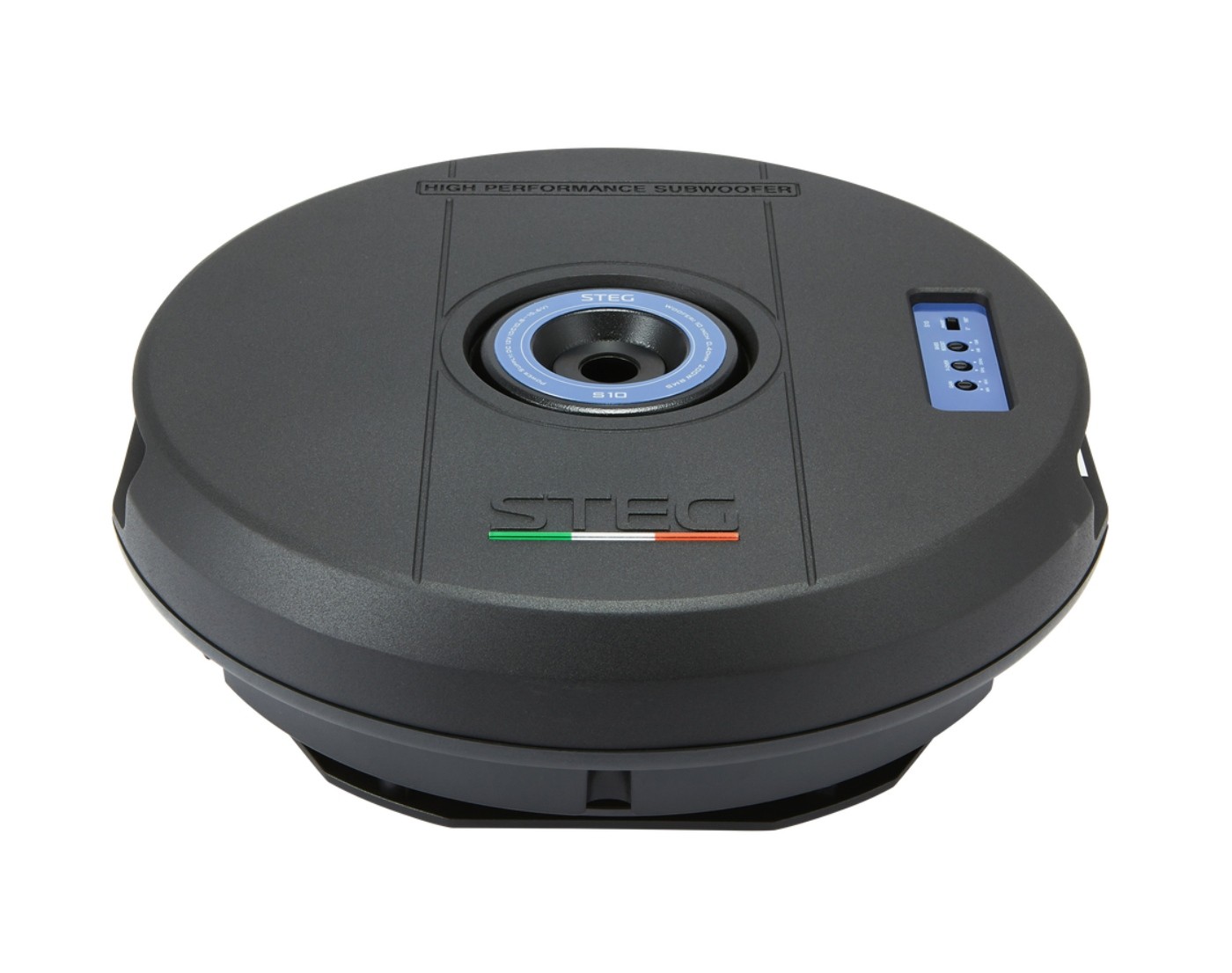 Малък, скрит и мощен - това са основните характеристики на новия активен субуфер Steg S10, който се отличава и с лесен монтаж в резервната гума и здрава затворена озвучителна кутия от леян алуминий. Вграден дигитален усилвател с мощност 200 W RMS осигурява достатъчна мощност за подобряване на динамиката на звученето във всеки автомобил. На контролния панел могат да се настроят нивото на мощността, нискочестотният филтър или усилването на басите. Стандартно е наличен високонво вход за лесна интеграция в заводската система и можете да разчитате на автоматично включване и изключване на субуфера. В комплекта ще намерите кабелно дистанционно управление и монтажни принадлежности.
