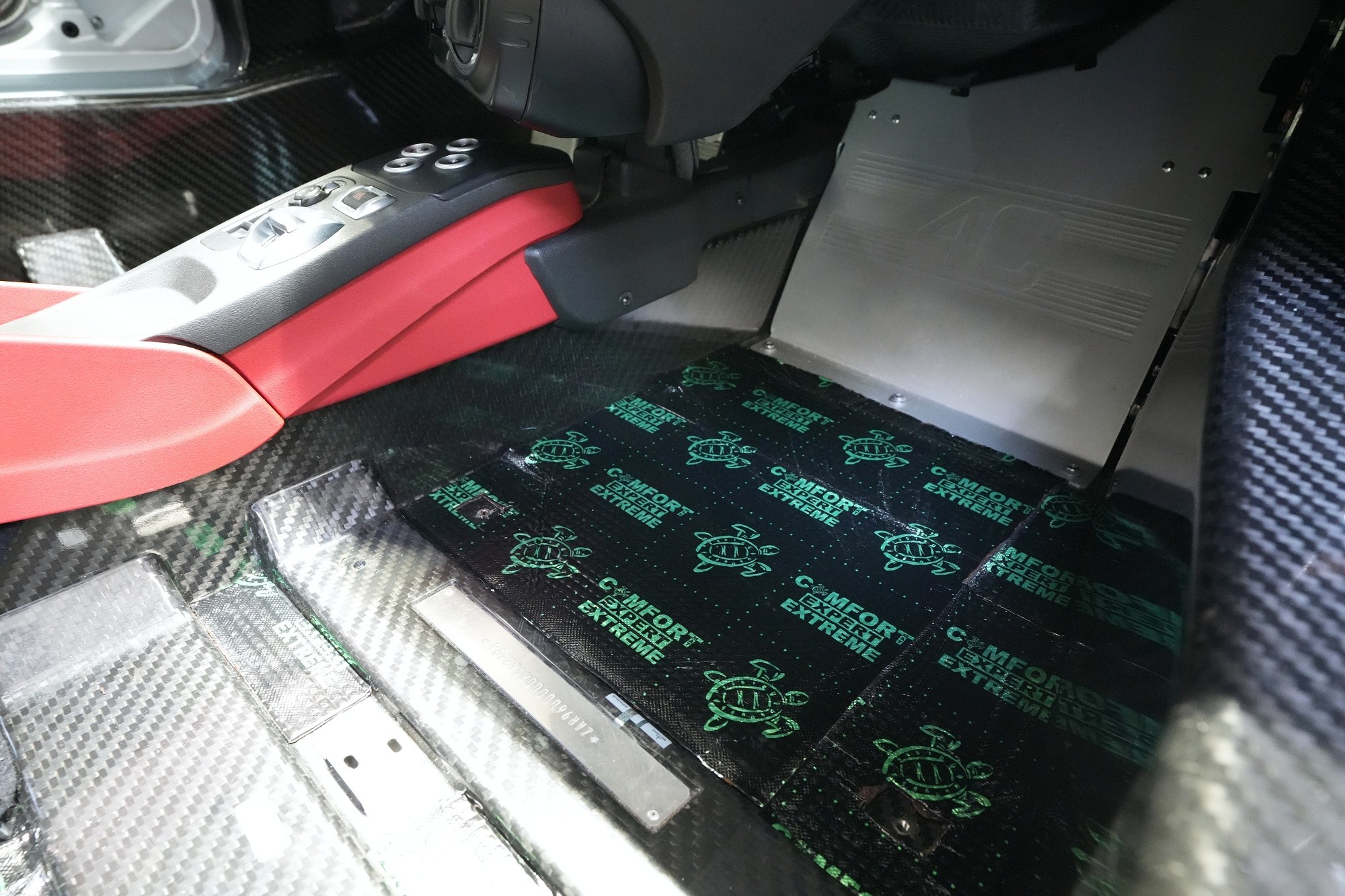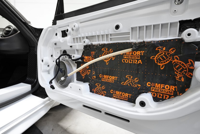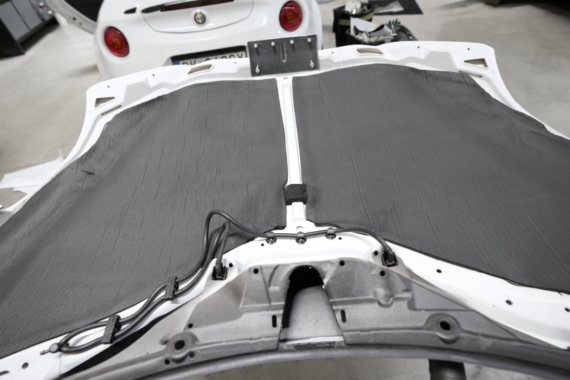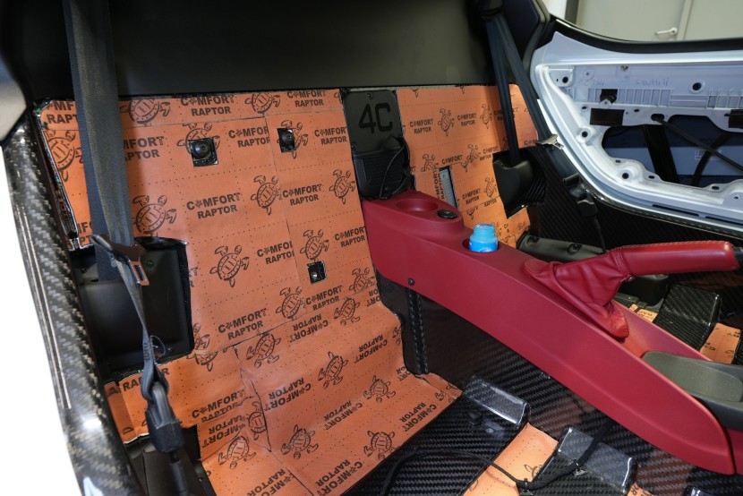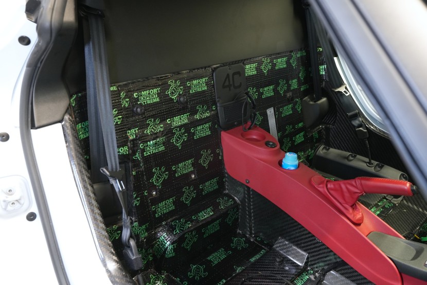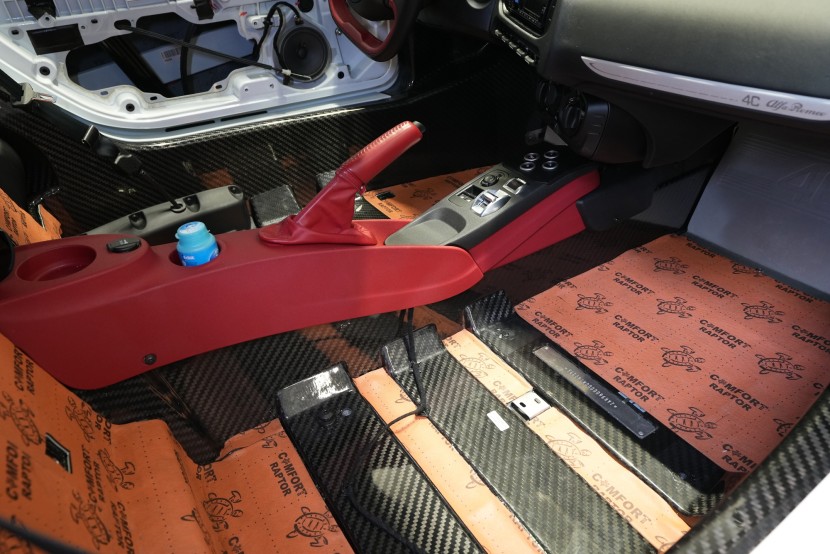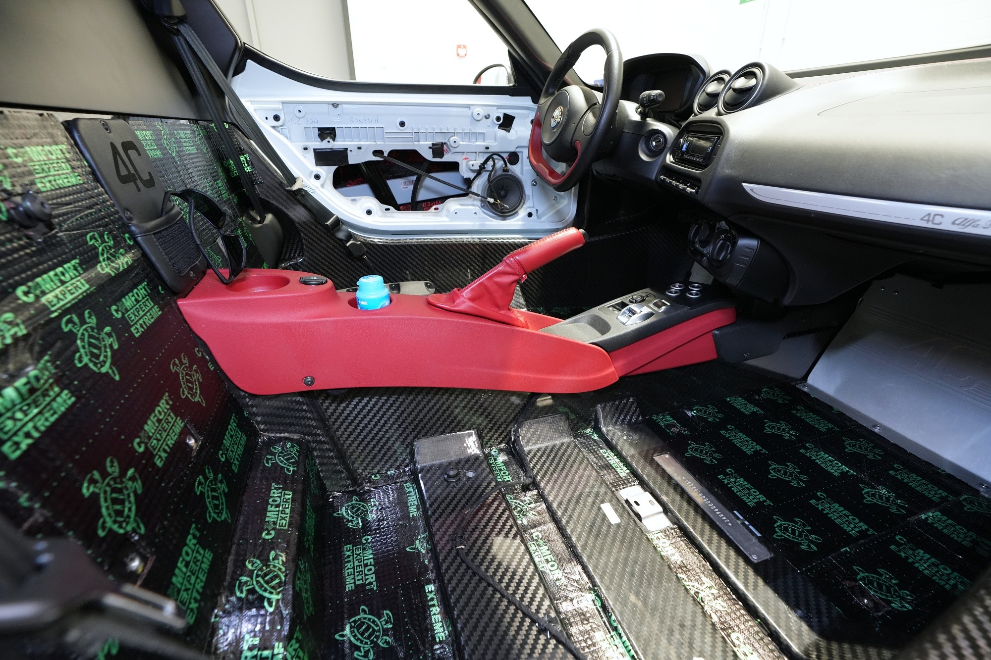 Този път в нашия сервиз се появи много интересен автомобил, а именно спортният Alfa Romeo 4C. И може би неочаквано за много от нашите последователи – за шумоизолация. Този лек и забавен автомобил с двигател с мощност 240 коня се струваше на собственика си прекалено некомфортен. Не е изненада, че този автомобил има напълно различни предимства от заводската звукова изолация. Тя от своя страна почти липсва, за да се намали максимално теглото на автомобила с цел по-добри пътни характеристики. Опитахме се да намерим компромис между оптимално тегло и висока ефективност, което беше основната цел на собственика. Крайното количество от 27 kg материали считаме за приемлива стойност за запазване на отличните шофьорски качества с подобрен комфорт. За шумоизолацията на този автомобил се базирахме на нашия пакет шумоизолация Expert Plus, който индивидуално адаптирахме към нуждите на този автомобил. Над стандартната инсталация допълнително направихме облицовка на пода и задната част на автомобила, за да покрием новоаплицираните материали, тъй като този автомобил от завода няма никаква тапицерия. На автомобила работеха 2 от нашите техници едновременно и монтажът беше завършен в рамките на 1 работен ден.