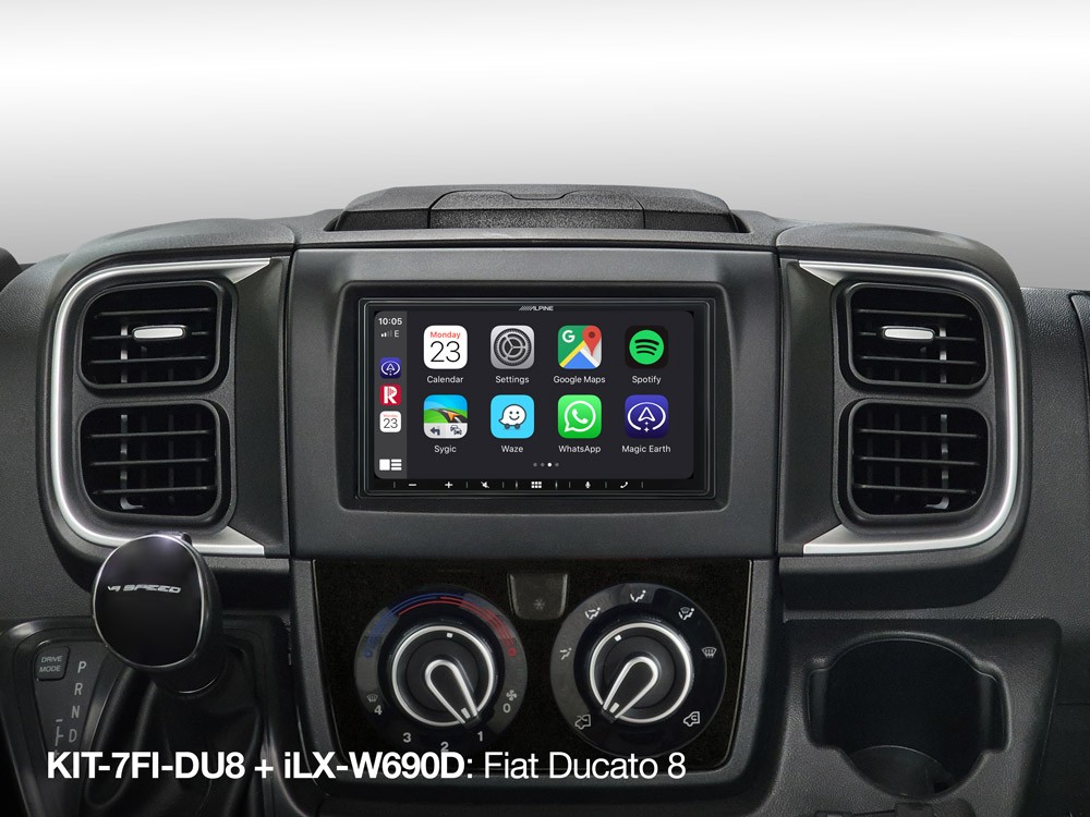 Инсталационният комплект KIT-7FI-DU8 ви позволява перфектно да интегрирате Alpine 2DIN навигационна или мултимедийна система в Fiat Ducato III версия 8. Съвместим е с Alpine INE-W611D / INE-W611DC, iLX-705D, iLX-W690D и INE-W720D / INE-W720DC. Включва всички метални скоби и винтове, plug-and-play кабелен сноп, интерфейс за управление от волана за перфектна инсталация и 2DIN пластмасова декоративна рамка за чиста интеграция в таблото ви. Ако вашето Ducato е оборудвано с оригинално Qi безжично зарядно за телефон, можете да го запазите с Alpine системата. Това изисква отделно продавания адаптер KWE-Qi-DU8.