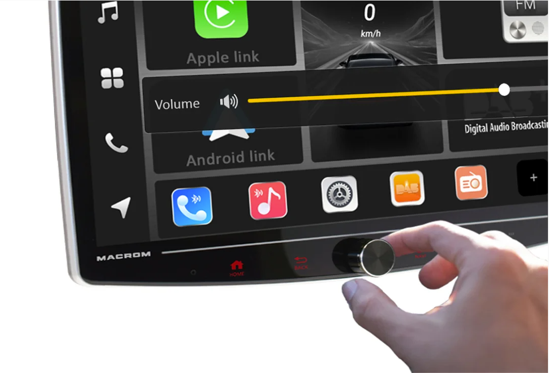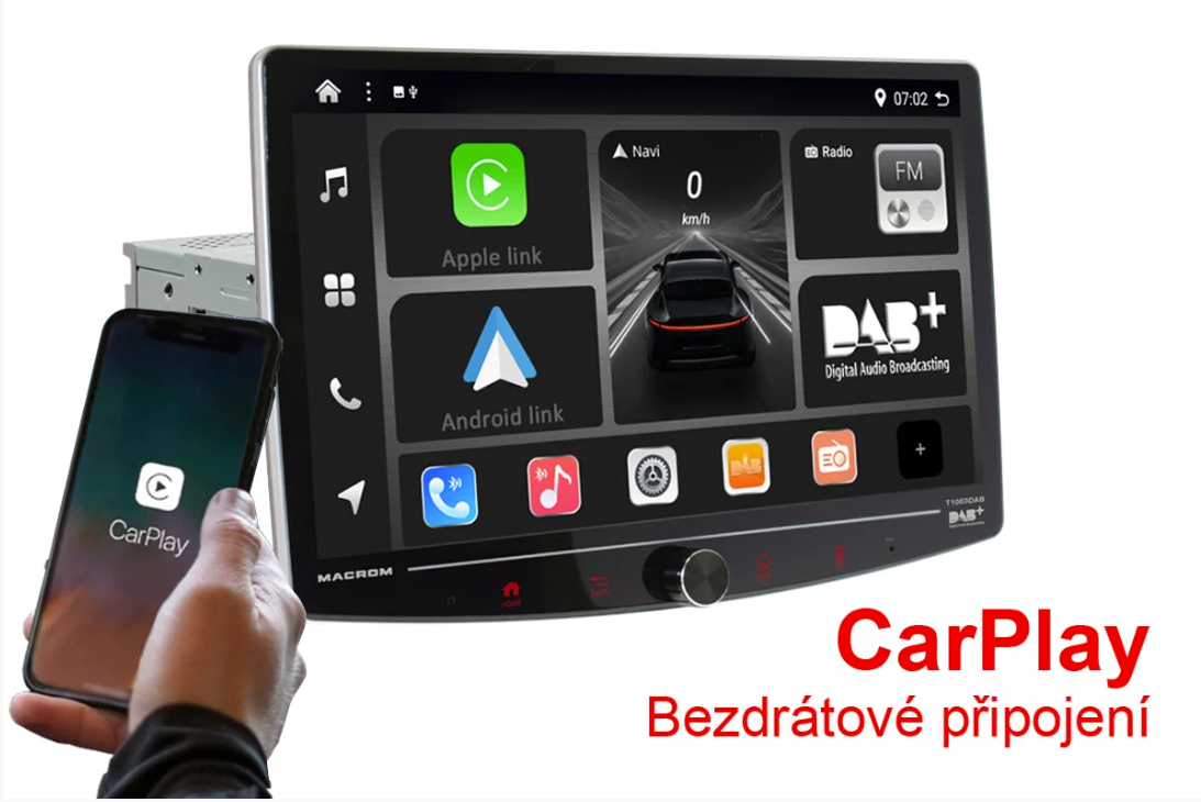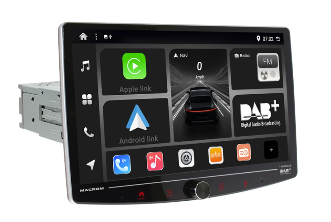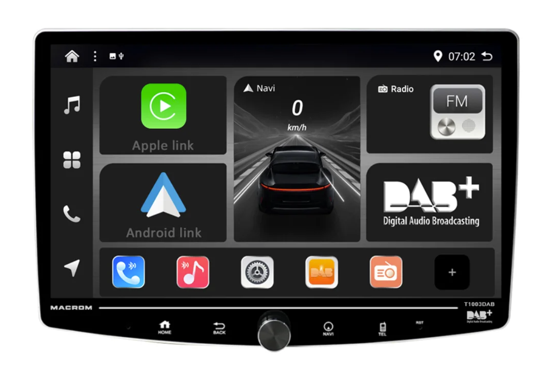 MACROM T1003DAB е висококласна мултимедийна станция за автомобил, която превръща вашия автомобил в модерно инфотейнмънт център. Елегантният 10″ QLED дисплей с Full HD резолюция (1920 × 1080) е въртящ се и регулируем по височина, за да можете лесно да нагласите ъгъла на видимост. Благодарение на мощния 8‑ядрен процесор и операционната система Android 13 устройството работи бързо и плавно. Поддържа безжично Apple CarPlay и Android Auto, онлайн навигация, Bluetooth handsfree и музикален стрийминг. Вграденият DSP процесор с 64‑ленти EQ осигурява перфектен звук, а бързото стартиране до 2 секунди предлага незабавна готовност за работа.