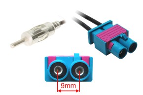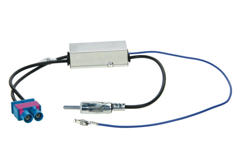 Антенен захранвач и суматор на сигнал за автомобили с антена с усилвател, захранван по антенното окабеляване (фантомно захранване). Използва се при инсталация на неоригинално автомобилно радио.- антенен конектор от антената в автомобила двойна FAKRA (женски)