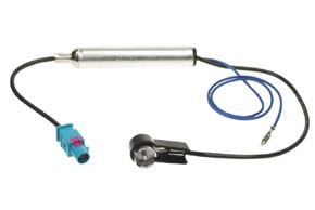 Антенен захранващ адаптер за автомобили с антена, чиито усилвател се захранва по антения кабел (фантомно захранване). Използва се при инсталиране на неоригинално авторадио.- антенен конектор от антената в автомобила FAKRA