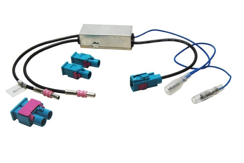 Антенен захранващ инжектор и смесител на сигнала за автомобили с двойна антена със усилвател, захранван по антения кабел (фантомно захранване). Използва се при инсталиране на автомобилно радио с един антенен вход.- антенен конектор от антената в автомобила двойна FAKRA (мъжки)