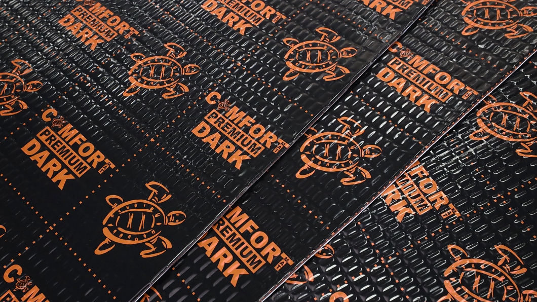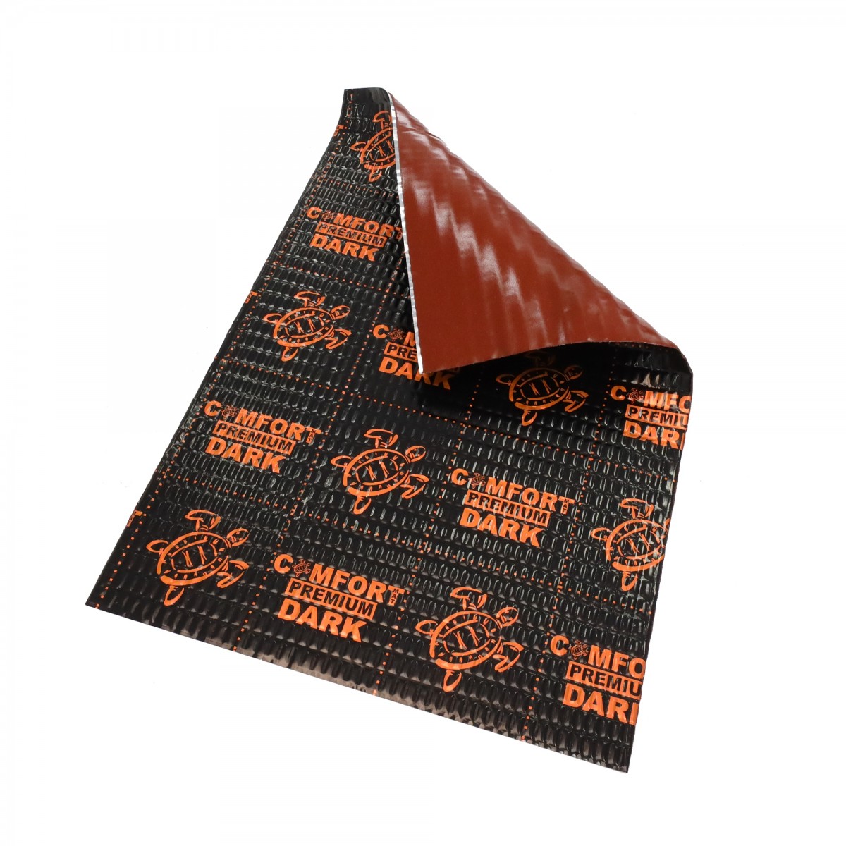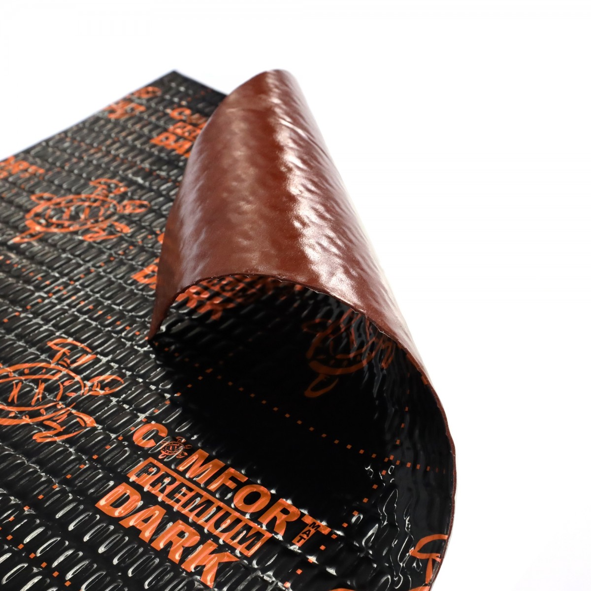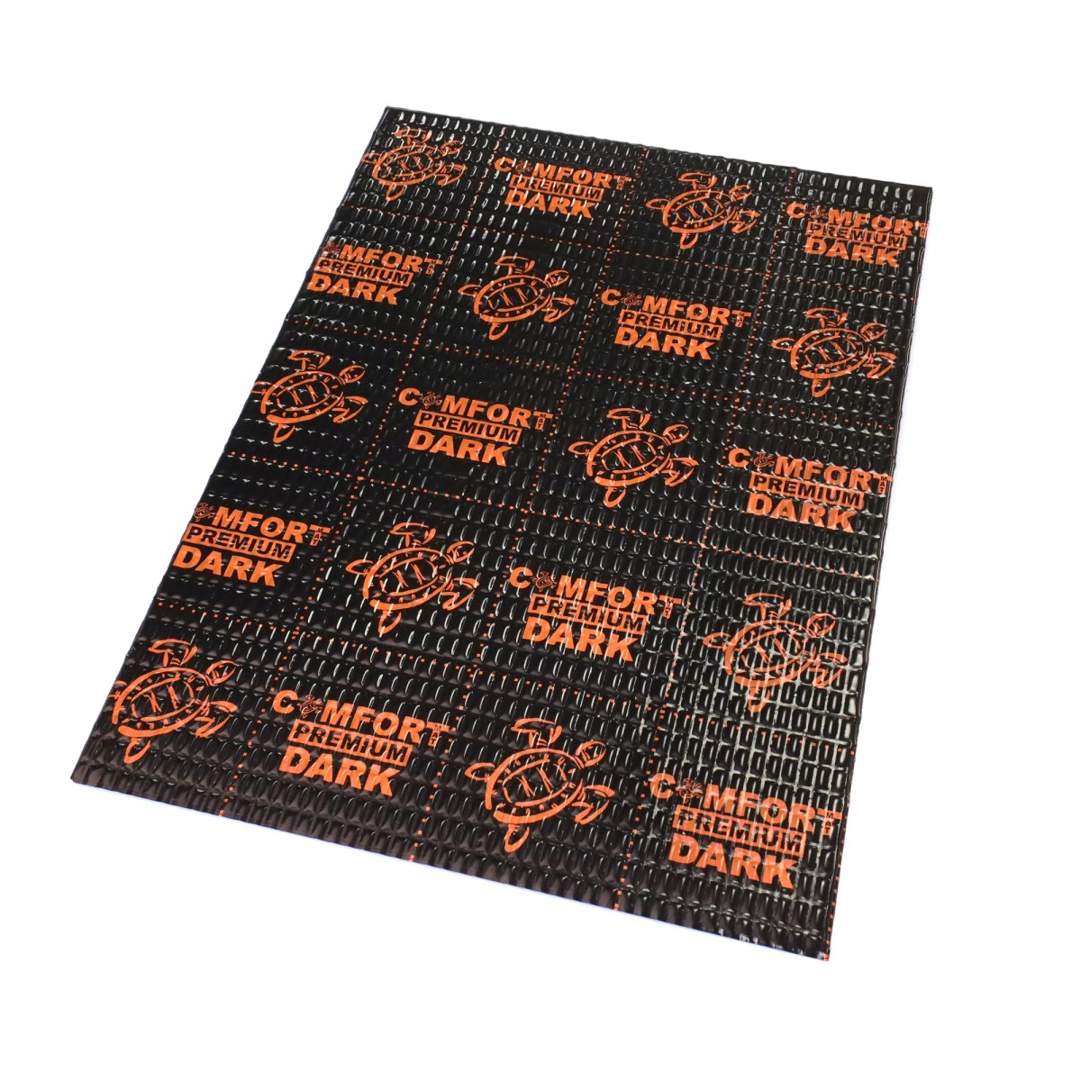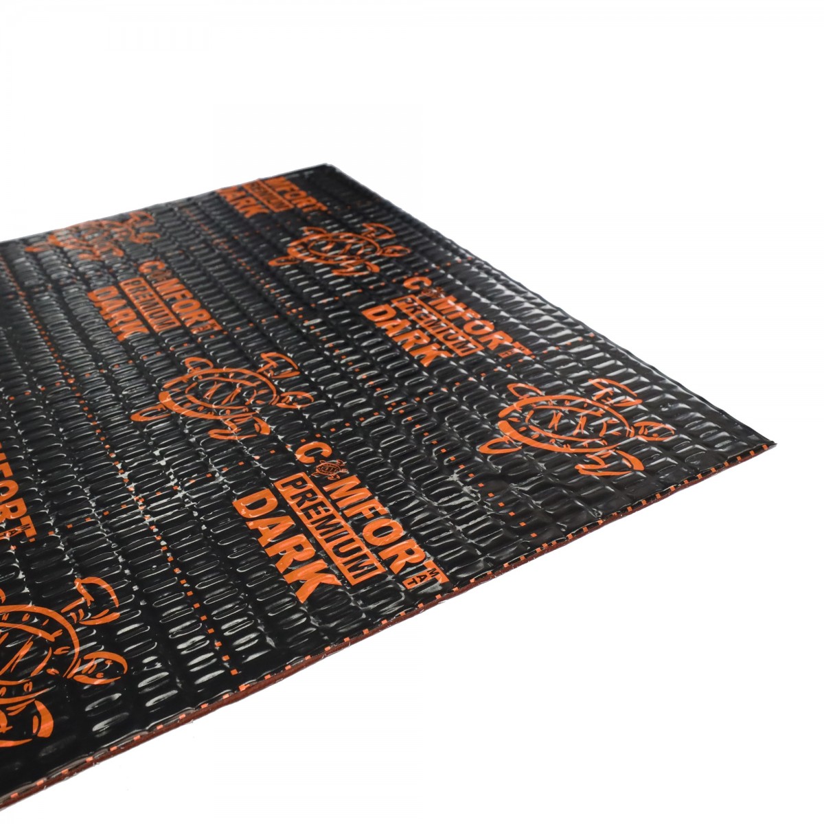 Премиум антивибрационен шумоизолационен материал Comfortmat от серията Dark, който принадлежи към премиум продуктите на Comfortmat. Той се състои от специален самозалепващ бутил-гума слой и алуминиева фолиа с правоъгълна релефна структура. Най-новата моделна серия Dark беше напълно обновена през 2019 г. и предлага напълно уникални свойства благодарение на високо ефективния и ултралеко състав на уплътняващото вещество D-Formula. Серийното производство на антивибрационните материали от серията Dark стана възможно след разработването на новата многоетапна технология на нискотемпературно смесване DarkAir. Благодарение на това бяха постигнати показатели, които преди това бяха недостъпни. Нито един друг антивибрационен материал в света не предлага такова съотношение тегло/ефективност. В Comfortmat успяха да създадат уникален материал, който в много отношения противоречи на очакванията – значително намалено тегло и същевременно повишен акустичен коефициент на загуби до преди това недостижими стойности. Както всички материали Comfortmat, и серията Dark изпъква с висока адхезия към метал, устойчивост на вода, влага и масла, антикорозионни свойства и запазва същите характеристики при екстремни температури както през лятото, така и през зимата.