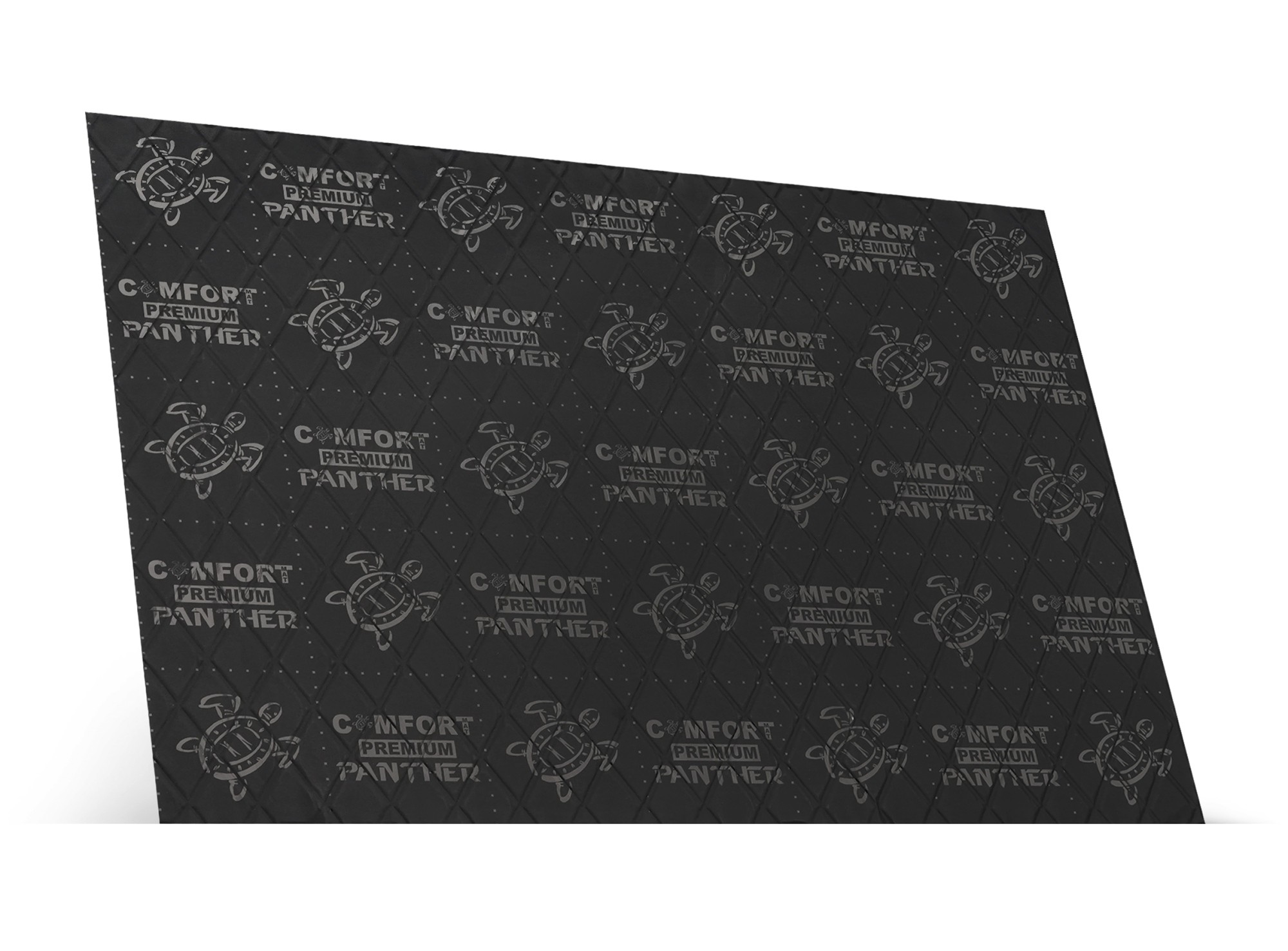 Comfortmat Panther е антивибрационен материал от премиум серията, чието най-голямо предимство е високата ефективност. Panther наследява всички най-важни свойства от антивибрационния материал Comfortmat Vespa и неговият състав е само малко различен, но значимо подобрен за увеличаване на ефективността. Panther използва усъвършенствано уплътняващо вещество Poison от най-ново поколение, от смес на специални полимери, което осигурява висок акустичен коефициент на загуби, надстандартна адхезия към метал и широк температурен диапазон при експлоатация. Освен иновативното уплътняващо вещество, Panther получи и допълнително подобрение под формата на алуминиева фолиа Scale One от иновативна сплав, която придава на материала изключителна якост и значително увеличава неговата ефективност и стабилност. Тази фолиа е заета от по-напредналия материал Comfortmat Cobra и нейната дебелина е 120 µm. Резултатът е акустичен коефициент на загуби (MLF) със стойност 0,38, който гарантира перфектно потискане на вибрациите, и предвид дебелината и високата якост на фолиото, материалът е подходящ и за инсталации на по-мощни аудио системи. Целта беше също така да се създаде дискретен OEM дизайн без ярки цветове за ненатрапчива апликация. Луксозната комбинация от матов черен фон с гланцови черни надписи осигурява изключителен външен вид, свързан с произхода на името. Матовият финиш допълнително подобрява адхезията със следващия слой шумоизолация.