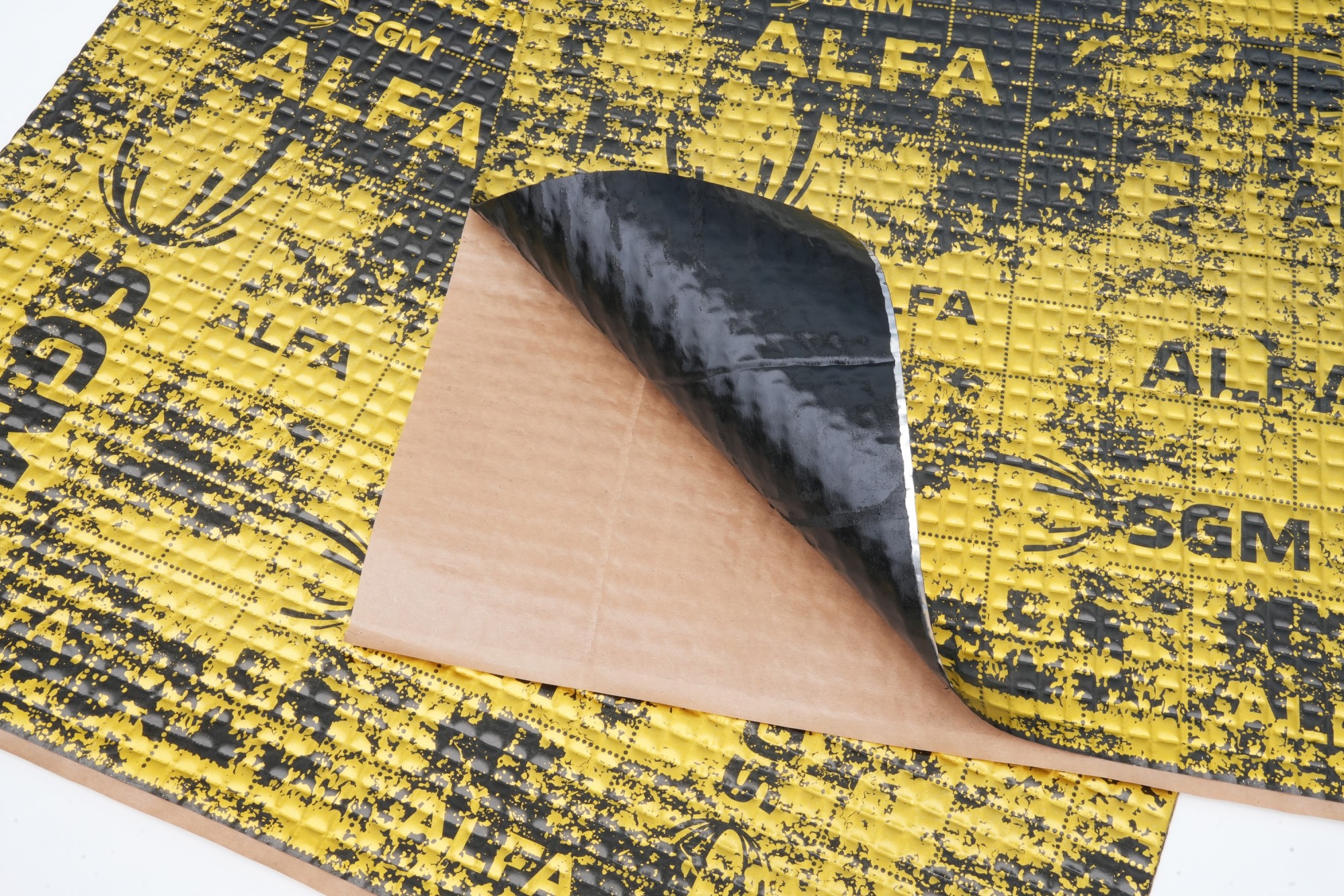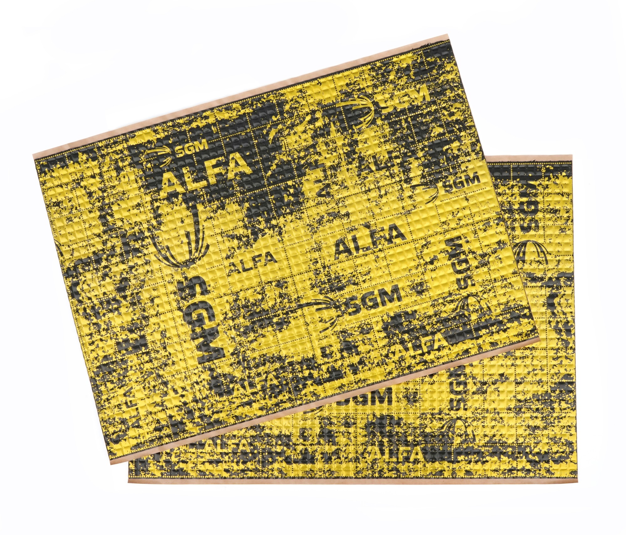SGM Alpha 2, поради дебелината си 2 мм и надстандартния акустичен загубен коефициент, е подходящ предимно за зони със средно до средно-високо вибрационно натоварване. Alpha 2 е идеален например за външния и вътрешния лист на вратите и намира приложение и като първи слой при обезшумяване на покрива, калниците, дъното на багажника или пластмасовите подкалници. За правилната работа е задължително при нанасяне да се използва притискащ валяк и да се осигури перфектен контакт с повърхността. Препоръчително използване:- Външен лист на вратите