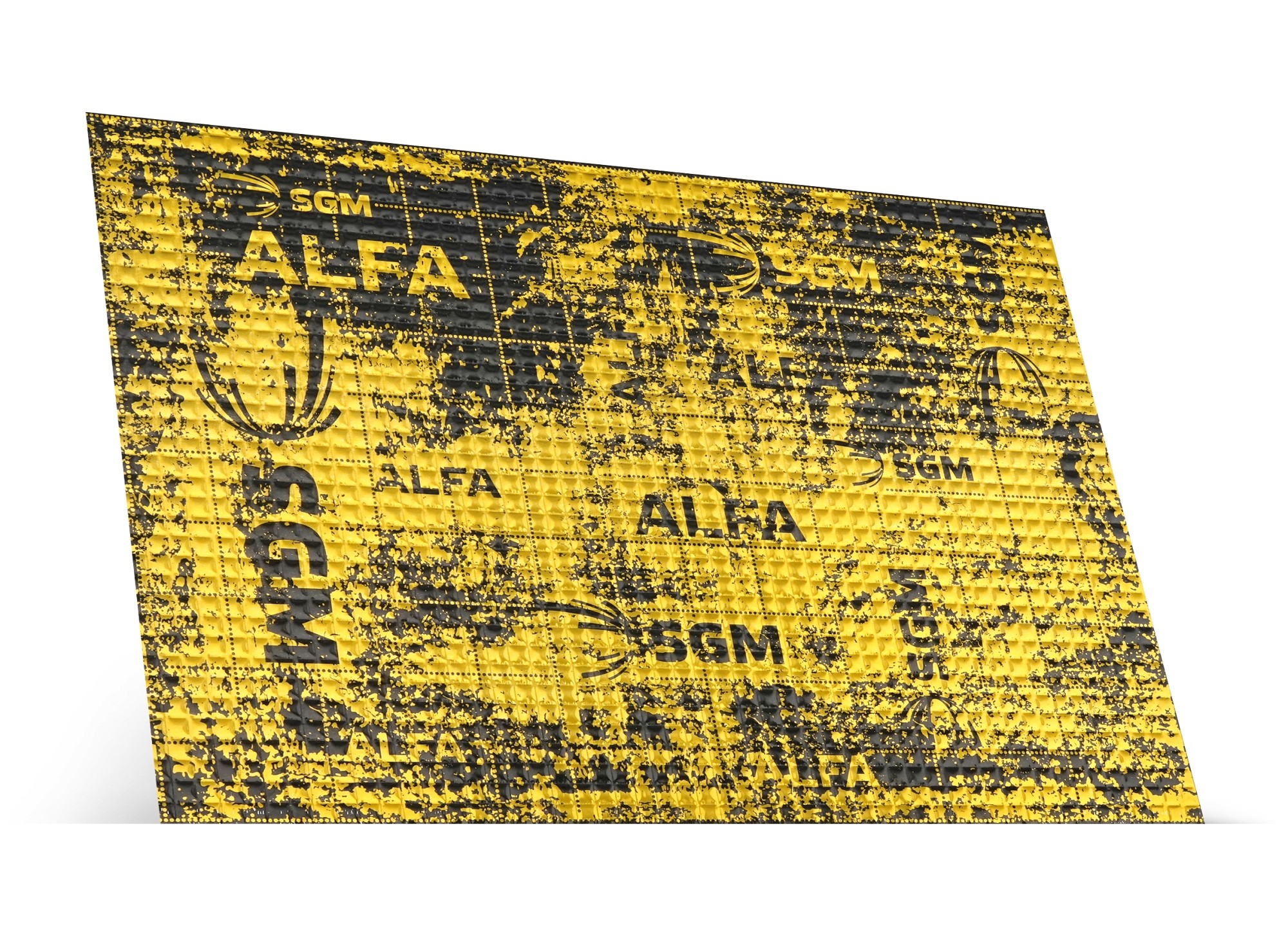 SGM Alpha 2 е усъвършенстван антивибрационен материал от класическата гама на SGM, който комбинира бутийлова гума с подобрена адхезия и алуминиево фолио с дебелина 90 микрона. Благодарение на конструкцията си гарантира ефективно заглушаване на вибрациите на купето, антикорозионна защита на металните части и висока стабилност дори при екстремни температури в диапазона –40 °C до +100 °C. Монтажната страна е защитена със силиконизирано фолио, което значително улеснява инсталацията. Оптималната дебелина 2 мм осигурява отличен баланс между маса, ефективност и простота на монтажа. Alpha 2 е подходящ предимно за обезшумяване на врати, покрив или дъното на багажното пространство – тоест зони, където е необходимо високо ниво на виброизолация при запазване на ниско тегло. Отличава се с много висок акустичен загубен коефициент (MLF 0,34), здравина и дълъг живот. Основната разлика в сравнение с серията Beta е значително по-високата ефективност благодарение на подобрения състав на материала, както и по-добрата адхезия към метала и по-дебелото алуминиево фолио.