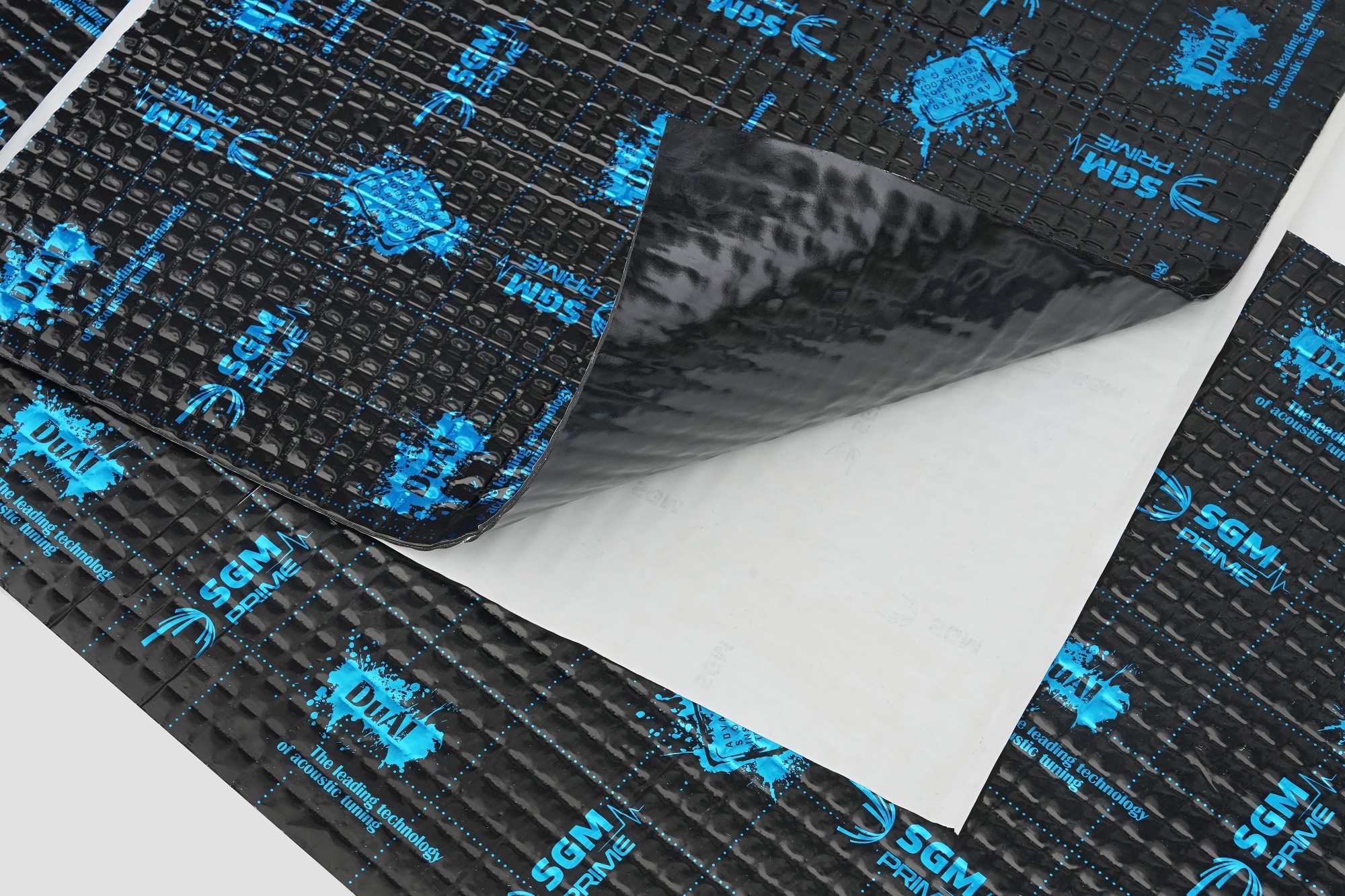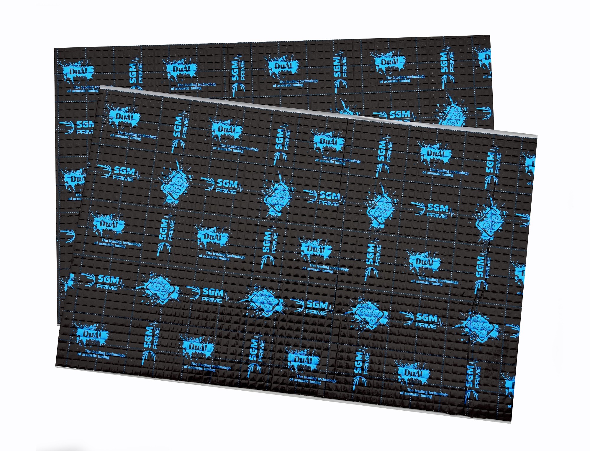 SGM Dual представлява връх в развитието на антивибрационните материали на марката SGM и принадлежи към най-високата моделна серия Prime. Този премиален двуслоен материал с дебелина 4 мм е съставен от комбинация на два различни бутилкаучукови уплътнителя, разделени с алуминиево фолио с дебелина 100 микрона. Външната повърхност също е покрита с фолио с идентична дебелина, което създава двуслойна конструкция с висока твърдост и изключителна способност да потиска вибрациите. Специалната конструкция осигурява изключително висок акустичен коефициент на загуби (MLF = 0,66) при същевременно ниско тегло, което го прави най-ефективния виброизолационен материал в цялата серия Prime. Двойният слой уплътнител от различни смеси запазва оптималния баланс между ефективност, тегло и адхезия към метални повърхности. Материалът предоставя също отлични антикорозионни и уплътняващи свойства и е напълно устойчив на вода, влага, масла и екстремни температури в диапазона от –40 °C до +120 °C. Благодарение на своята гъвкавост не изисква предварително нагряване при инсталация, което го прави лесен за употреба продукт. Dual е идеален за зони с много високо вибрационно натоварване, където се изисква абсолютното потискане на резонансите без значително увеличаване на теглото на каросерията.