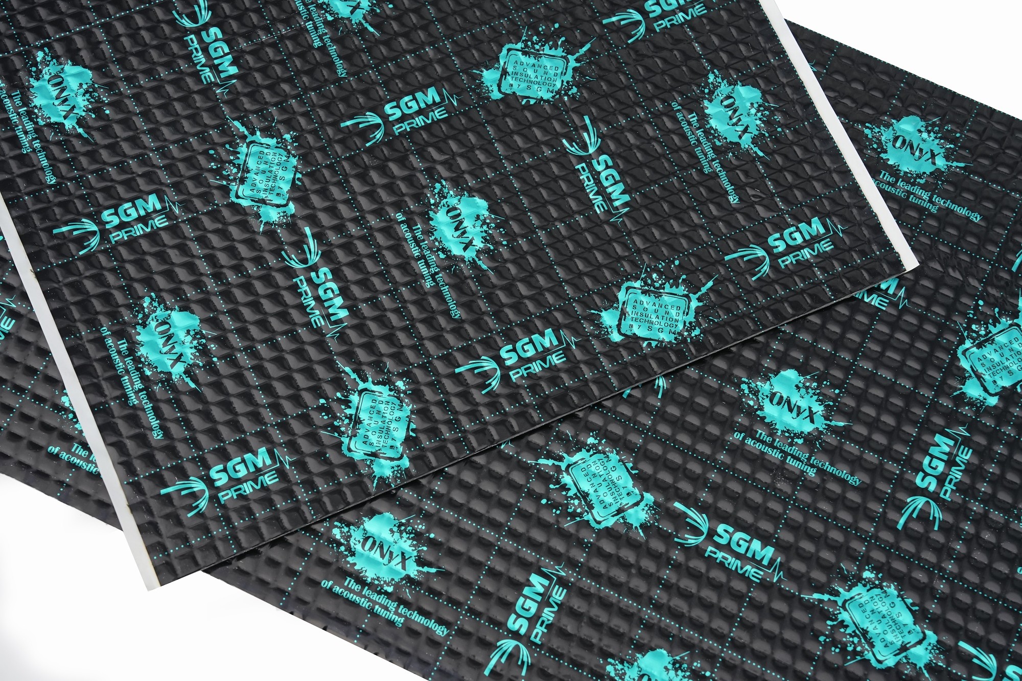 SGM Prime Onyx 2 е премиум антивибрационен материал от най-високата моделна серия Prime на SGM, който представлява идеален избор за области, изискващи ефективно заглушаване на вибрациите без излишно натоварване на конструкцията. Комбинира модерен бутил-каучуков уплътнител от ново поколение с алуминиево фолио с повишена дебелина 120 микрона, което придава на материала висока здравина, твърдост и дългосрочна стабилност. Благодарение на подобрения състав на уплътнителя Onyx запазва висока еластичност и ефективност дори при екстремни температури в разширен диапазон от –60 °C до +140 °C. Уплътнителят запазва оптимална адхезия към метални повърхности дори в тежки климатични условия, за които материалът е разработен. Алуминиевото фолио с черен лак и модерен печат подобрява не само външния вид, но и адхезията при нанасяне на допълнителни слоеве шумоизолация. С оглед на балансираното си тегло, висока ефективност и ниска дебелина 2 mm, SGM Prime Onyx е подходящ и за места, където е необходимо точно да се запази геометрията на повърхността, например под задните седалки или в пространства с ограничено място.