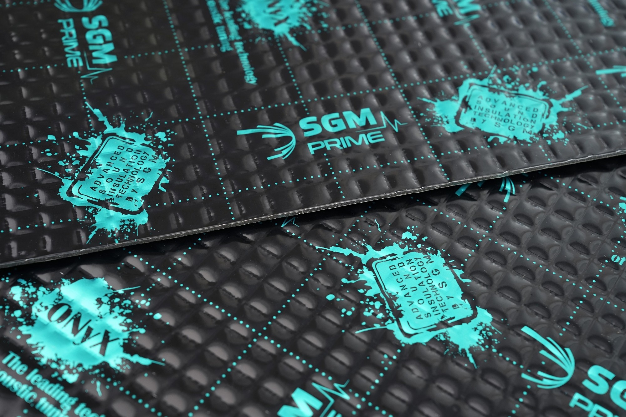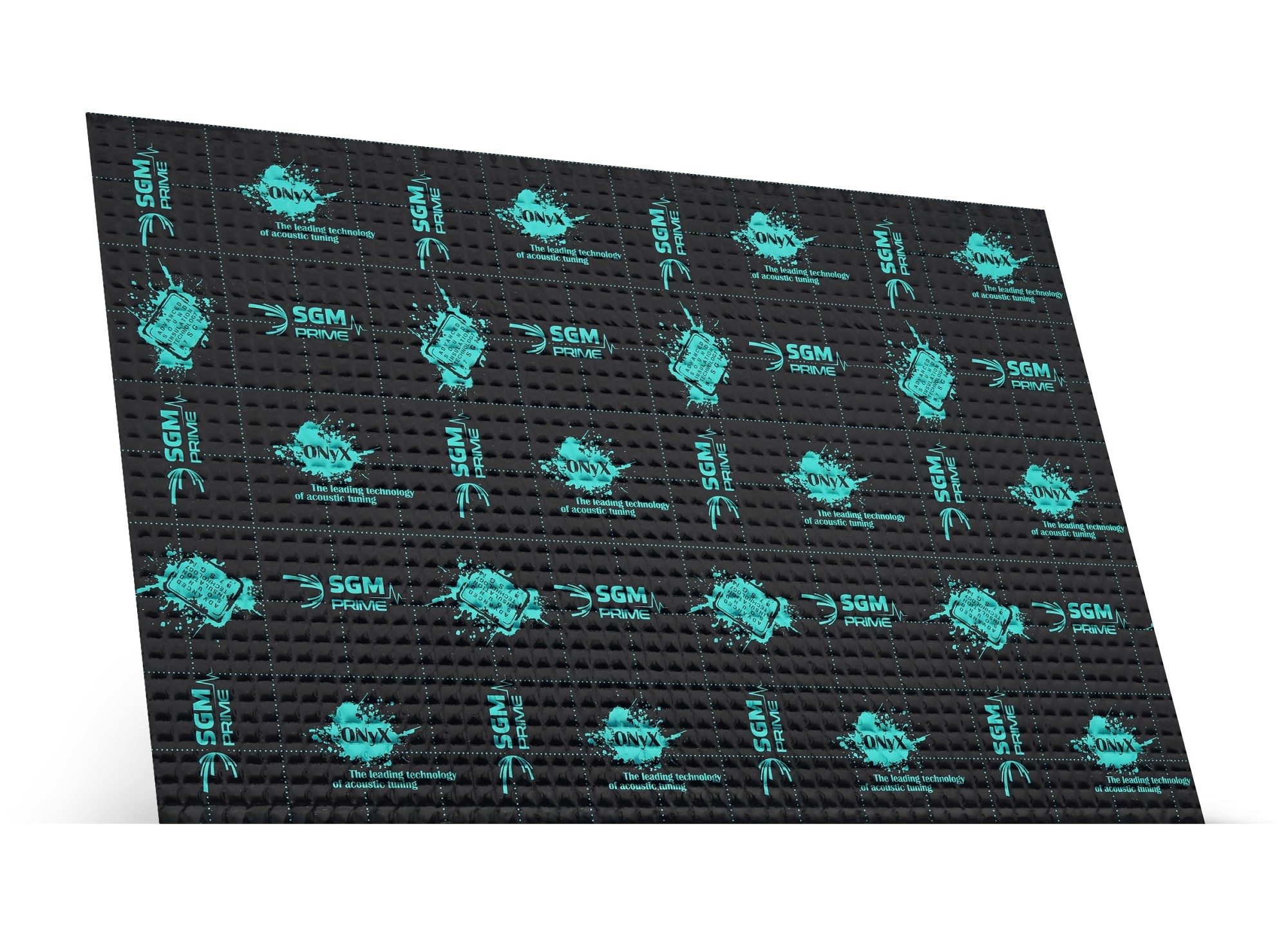 SGM Prime Onyx 3 е премиум антивибрационен материал от най-високата моделна серия Prime на SGM, който е сред най-модерните и най-ефективни антивибрационни материали на съвременния пазар. Onyx комбинира върхова ефективност с висока механична стабилност и изключителна гъвкавост при инсталация. Високата ефективност на материала се дължи предимно на вискозно-еластичната структура на уплътнението от най-ново поколение и алуминиевото фолио с дебелина 120 микрона, което значително повишава здравината, твърдостта и устойчивостта на деформация. Благодарение на това Onyx 3 постига акустичен коефициент на загуби 0,47, което осигурява изключителна способност за потискане на вибрациите и резонансите на каросерията дори в най-натоварените области. Onyx запазва висока еластичност дори при екстремно ниски температури под нулата и благодарение на балансираното си тегло не претоварва конструкцията на превозното средство. Повърхността на материала е покрита с черен лак с модерен печат и квадратно пресоване, което улеснява прецизното рязане и нанасяне. Както всички материали от серията Prime, и Onyx 3 е устойчив на вода, влага, масла и соли, както и на екстремни температури.