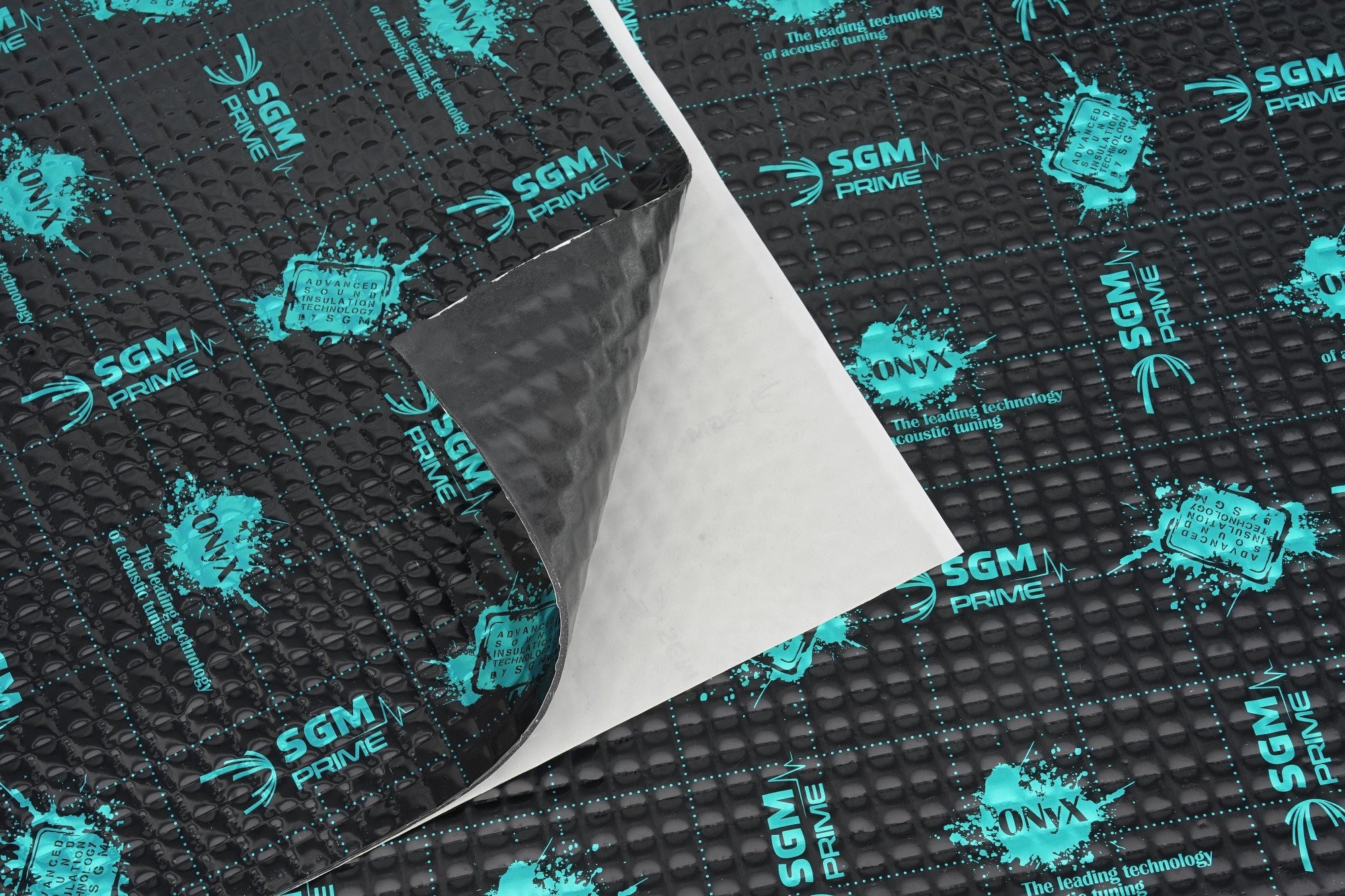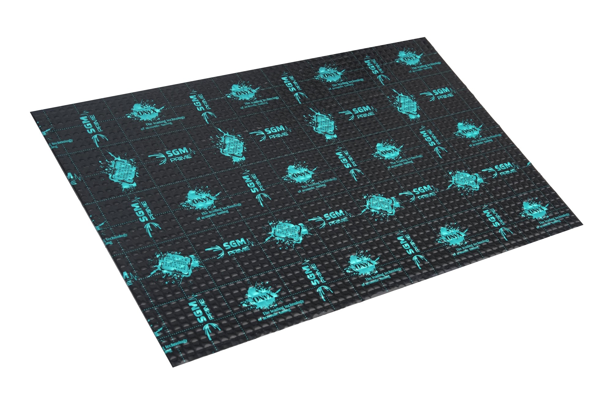 SGM Prime Onyx 4 е най-мощният антивибрационен материал от върховата моделна серия Prime на SGM. Той е сред технически най-напредналите виброизолационни материали на съвременния пазар и е предназначен за зони с екстремно вибрационно натоварване. Комбинира подобрен бутил-каучуков уплътнител от най-ново поколение с алуминиево фолио с дебелина 120 микрона, което увеличава здравината, твърдостта и експлоатационния живот на материала. Благодарение на конструкцията си Onyx 4 осигурява незабавно поглъщане на структурни вибрации без тяхното разпространение по каросерията и постига изключително висока ефективност с акустичен коефициент на загуби 0,55. В същото време запазва гъвкавост и ефективност и при екстремни температури от –60 °C до +140 °C и се отличава с отлично прилепване към метални повърхности. Onyx 4 е предназначен за локална виброизолация на критични области, като арки на колелата, багажник или под, където е необходимо незабавно поглъщане на резонанси с висока амплитуда. Повърхността с черен лак и пресоване улеснява прецизното рязане и монтаж, докато силиконизираният защитен слой осигурява удобна инсталация. Материалът е устойчив на вода, влага, масла и соли и притежава антикорозионни свойства, характерни за всички материали SGM.