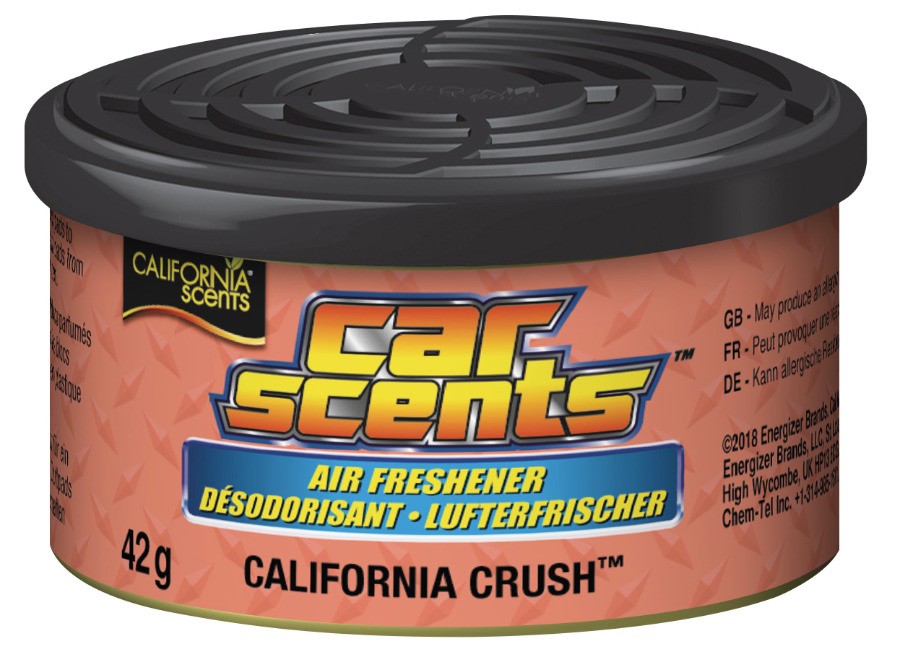 Оригинален освежител за въздух с твърдо пълнене в практична малка метална кутийка, която бързо ароматизира вашия автомобил, жилище или офис. Кутията има черен пластмасов капак с въртящ се регулатор, с който можете да променяте интензивността на аромата. Забравете за освежителите и ароматите за автомобил, които губят интензивността си след няколко дни. Луксозните, чувствените и интензивни аромати California Scents са тук, за да ви покажат какво означава наистина дълготраен и приятен аромат в автомобила. Всяка кутия Car Scents® съдържа три блока пресован лен, наситен с парфюм. Благодарение на твърдата консистенция на освежителя за въздух California Scents няма риск от изтичане на течност, която да повреди таблото ви.Природни и екологични аромати за автомобил