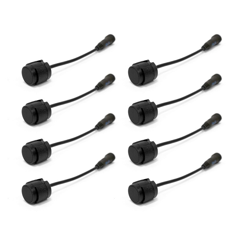асистент за паркиране с 8 вградени сензора в черен цвят 16 мм, с една управляваща единица, предназначен за монтаж в предната и задната броня на превозното средство, допълнен с LCD дисплей с цифров индикатор за удобна визуална индикация на разстоянието до препятствието