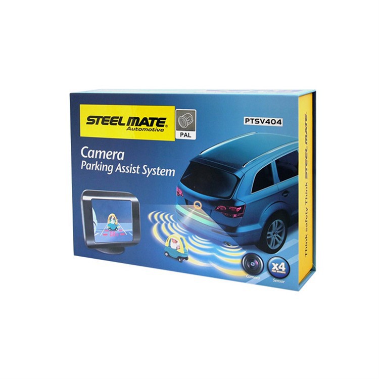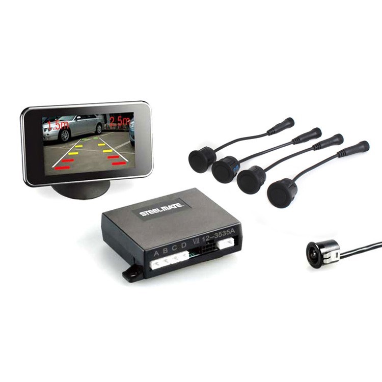 Асистентът за паркиране Steelmate с 4 сензора, паркинг камера и 3,5" TFT дисплей. Цветна камера с ъгъл на виждане 100° - предназначена за монтаж в задната броня. Мониторът показва изображението от камерата заедно с насочващи линии, разстоянието до препятствието и посоката, в която се намира препятствието. Асистентът за паркиране предупреждава за препятствие и със звукова сигнализация. Дисплеят позволява да се адаптира изображението към външните светлинни условия - настройване на яркост и контраст. По време на движение на монитора се показва часът. Асистентът за паркиране се активира автоматично при включване на задна предавка на автомобила.