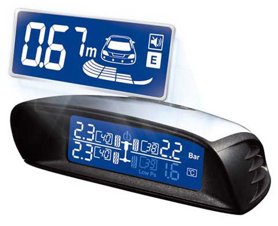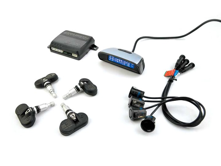 Асистент за паркиране и измервател на налягането в гумите STEELMATE с 4 паркинг сензора и 4 сензора за налягане, допълнен с LCD дисплей с цифров индикатор, звукова и гласова сигнализация. LCD дисплеят показва по време на движение състоянието на налягането в гумите и по време на паркиране показва разстоянието до препятствието. Системата така осигурява постоянен контрол над налягането в гумите, като предотвратява тяхното повреда (напр. при шофиране с недокачени гуми). Захранващо напрежение 12V.