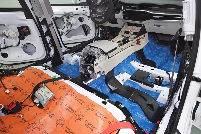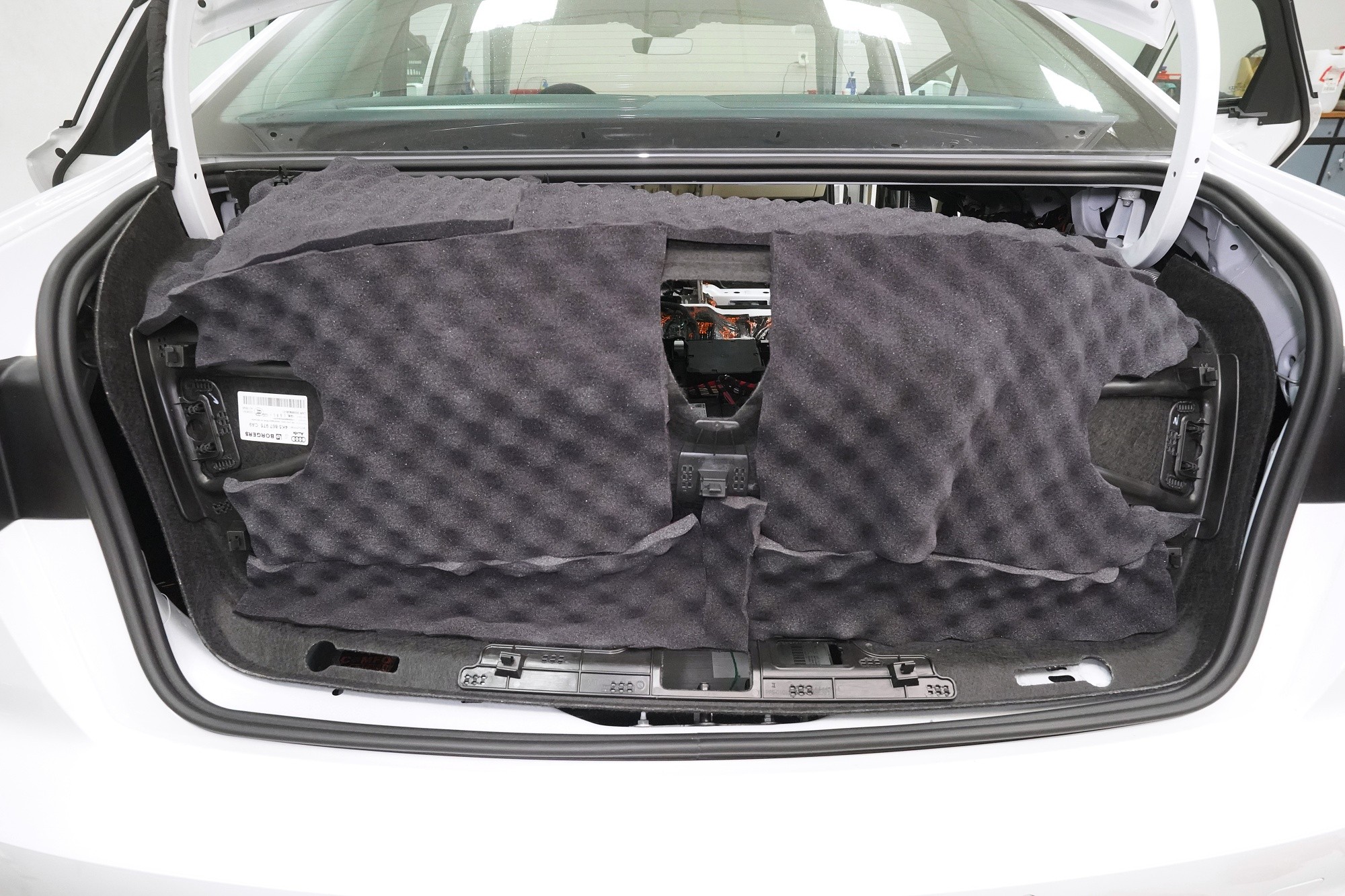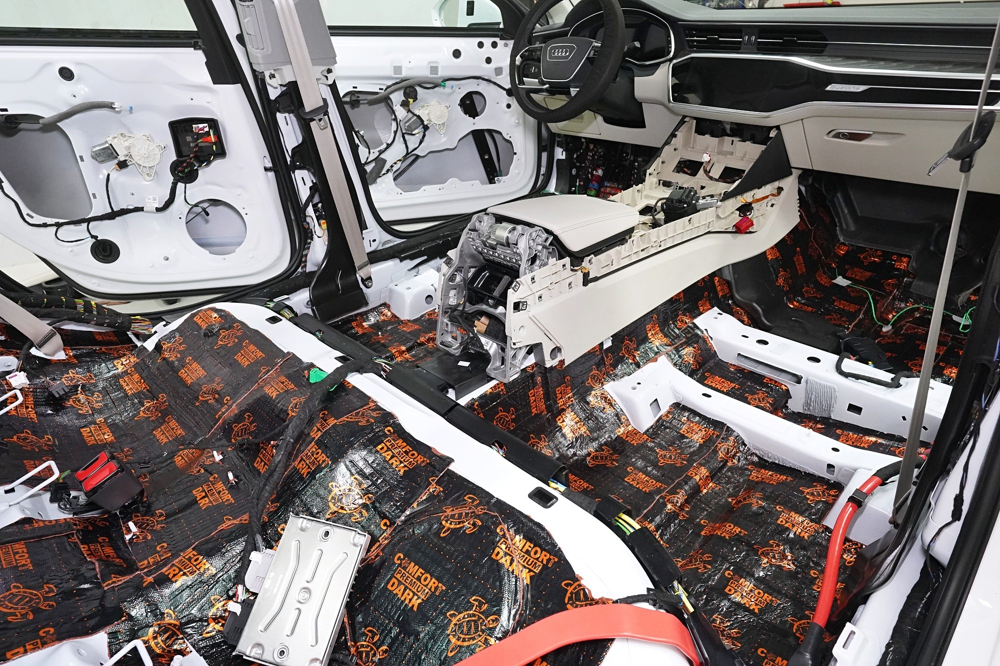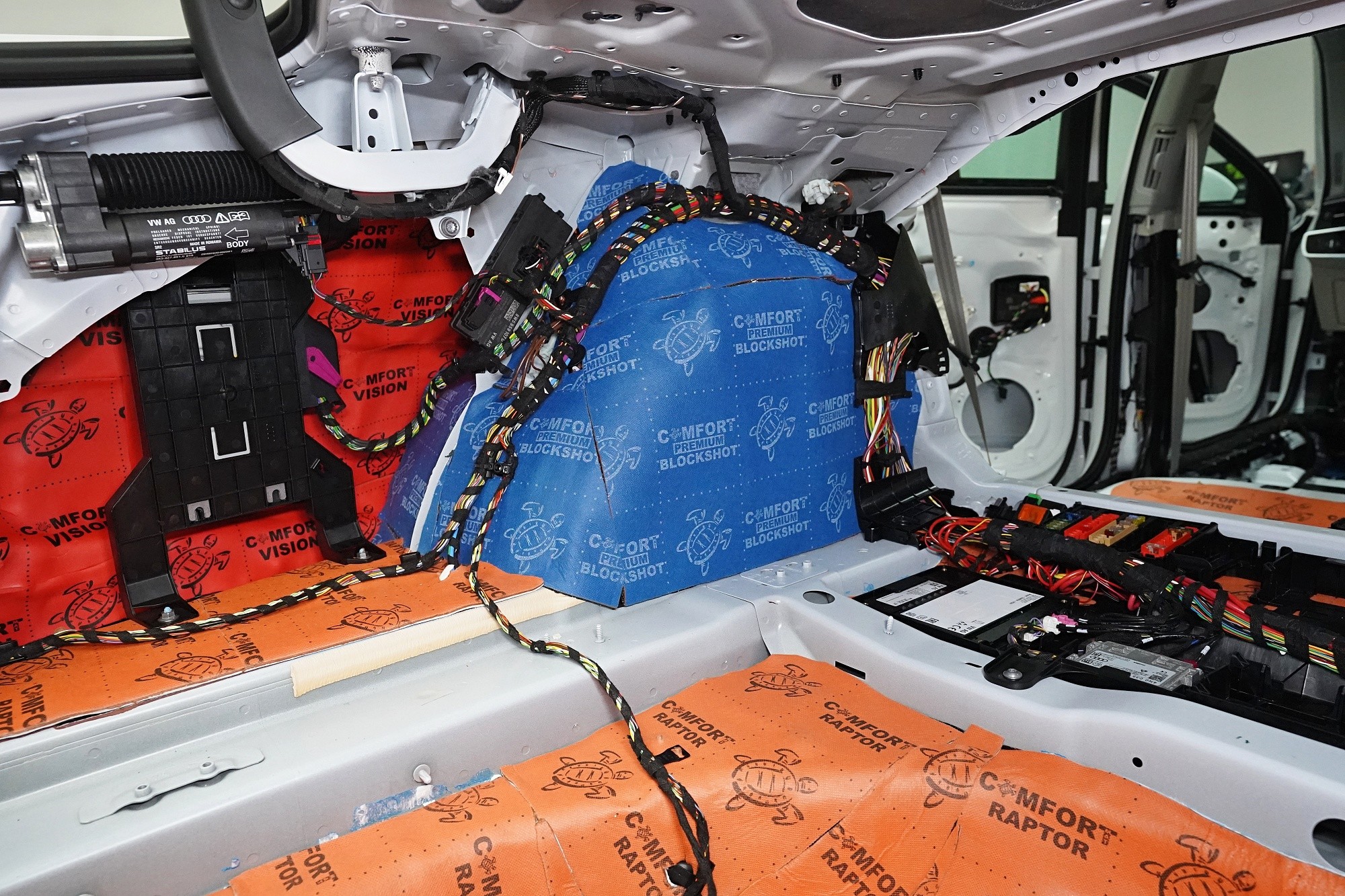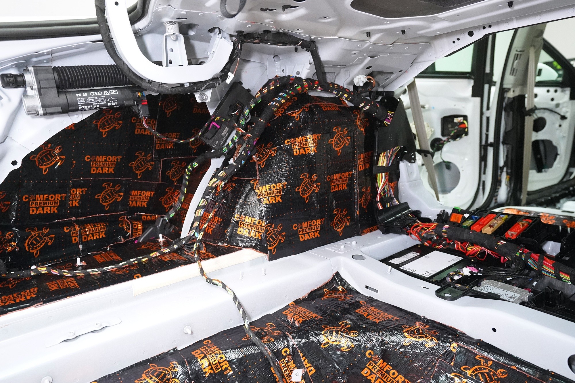 Шумоизолация на Audi A6, този път в нашия пакет Premium, индивидуално адаптиран. Собственикът на този автомобил ни даде строга задача: максимално тегло на материалите 60 kg. Всичко изчислихме подробно и нашият пакет Premium за този голям автомобил би имал тегло приблизително с 10 kg над лимита. Трябваше да намерим компромис. Компромисът се отнесе до антивибрационния материал на пода и дъното на багажното отделение. По-конкретно се отказахме от висококачествения материал Comfortmat Atom с дебелина 4 mm и избрахме олекотения антивибрационен материал Comfortmat Dark D3 с дебелина 3 mm, а за дъното на багажника вместо споменатия Dark D3, който обикновено използваме, приложихме същия материал, но с дебелина 2,3 mm. Така спестихме 10 kg материал, като ефективността на първия слой остава много висока. Шумоизолирахме предните, задните и петите врати, пода, багажното отделение, капака и предните и задните подкалници от вътрешната страна. За шумоизолацията работят едновременно четирима наши опитни техници, които монтират в рамките на 1 ден. Повече информация ще намерите в нашия фоторепортаж.