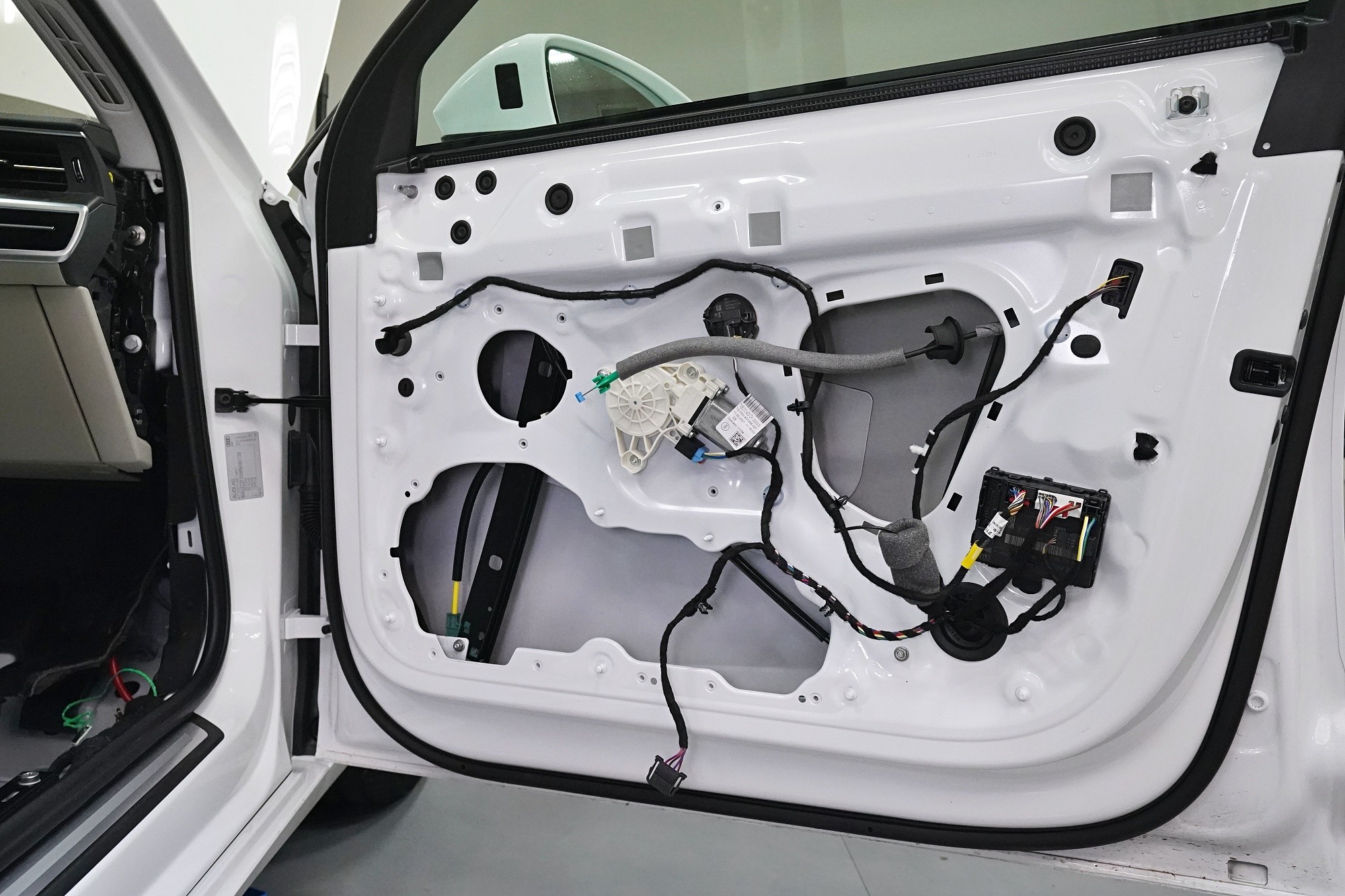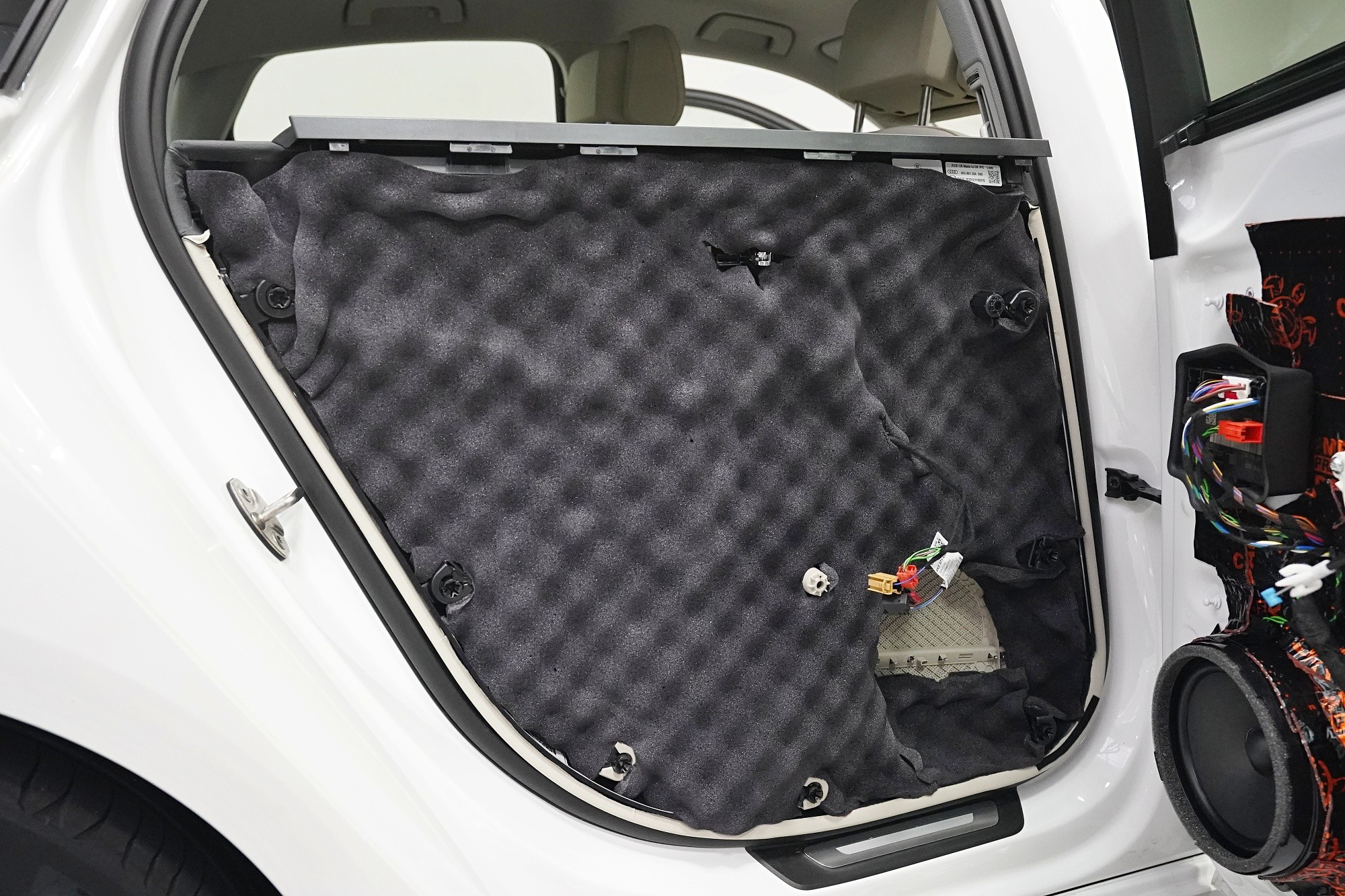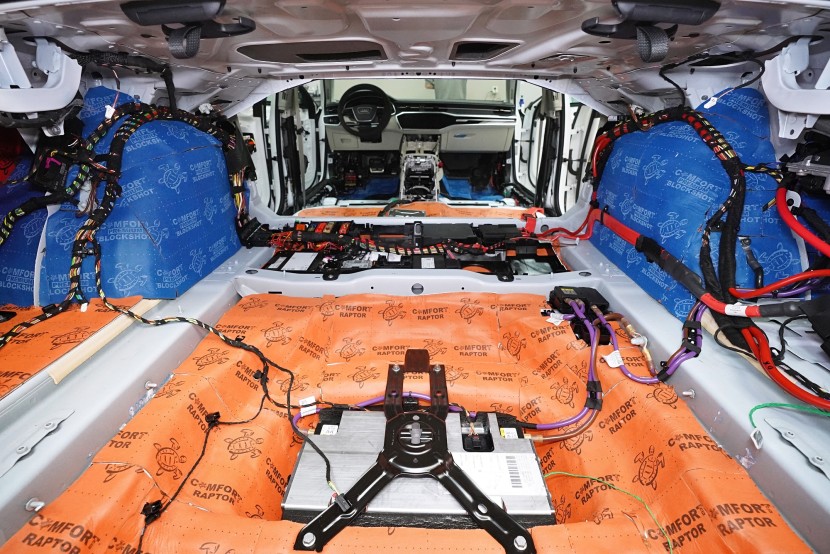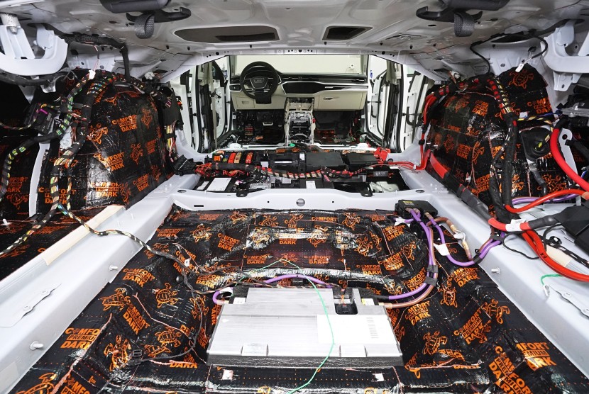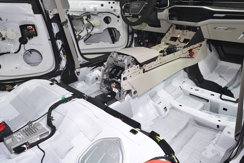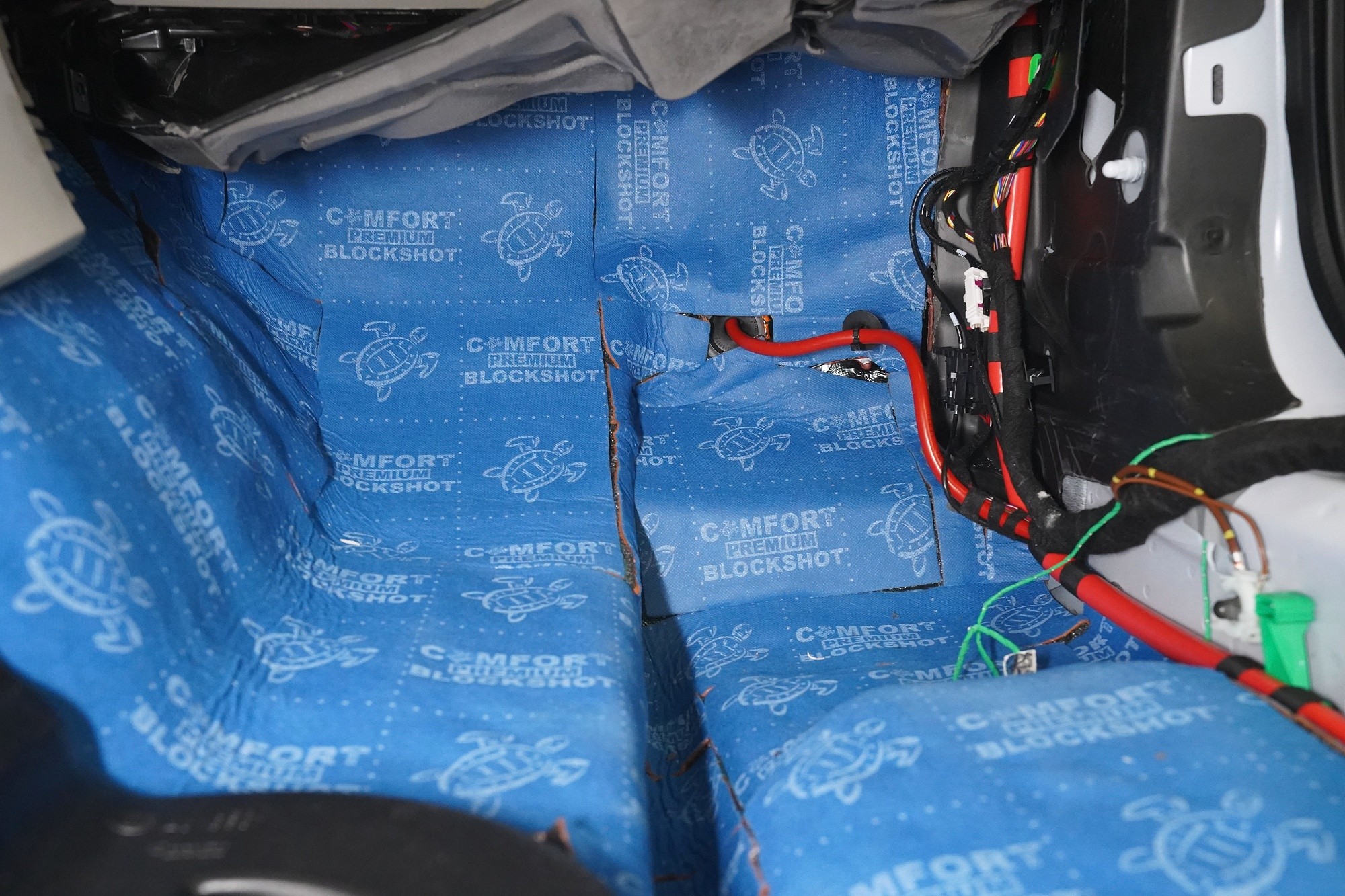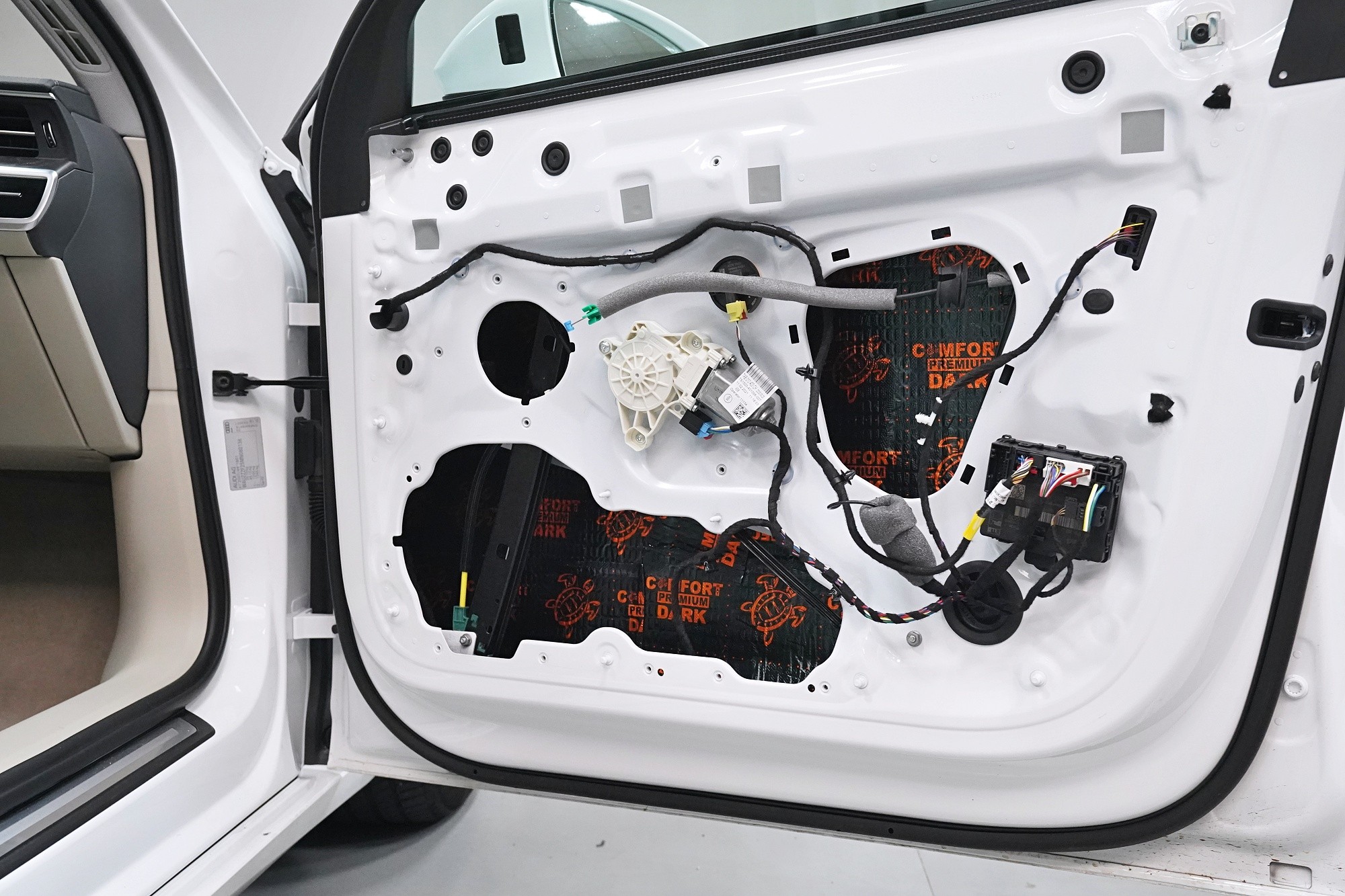 Шумоизолация на Audi A6, този път в нашия пакет Premium, индивидуално адаптиран. Собственикът на този автомобил ни даде строга задача: максимално тегло на материалите 60 kg. Всичко изчислихме подробно и нашият пакет Premium за този голям автомобил би имал тегло приблизително с 10 kg над лимита. Трябваше да намерим компромис. Компромисът се отнесе до антивибрационния материал на пода и дъното на багажното отделение. По-конкретно се отказахме от висококачествения материал Comfortmat Atom с дебелина 4 mm и избрахме олекотения антивибрационен материал Comfortmat Dark D3 с дебелина 3 mm, а за дъното на багажника вместо споменатия Dark D3, който обикновено използваме, приложихме същия материал, но с дебелина 2,3 mm. Така спестихме 10 kg материал, като ефективността на първия слой остава много висока. Шумоизолирахме предните, задните и петите врати, пода, багажното отделение, капака и предните и задните подкалници от вътрешната страна. За шумоизолацията работят едновременно четирима наши опитни техници, които монтират в рамките на 1 ден. Повече информация ще намерите в нашия фоторепортаж.