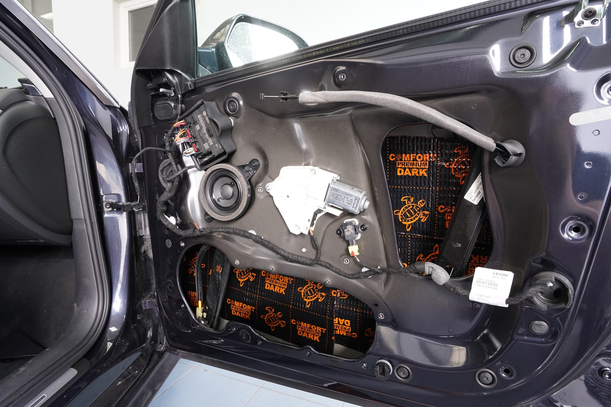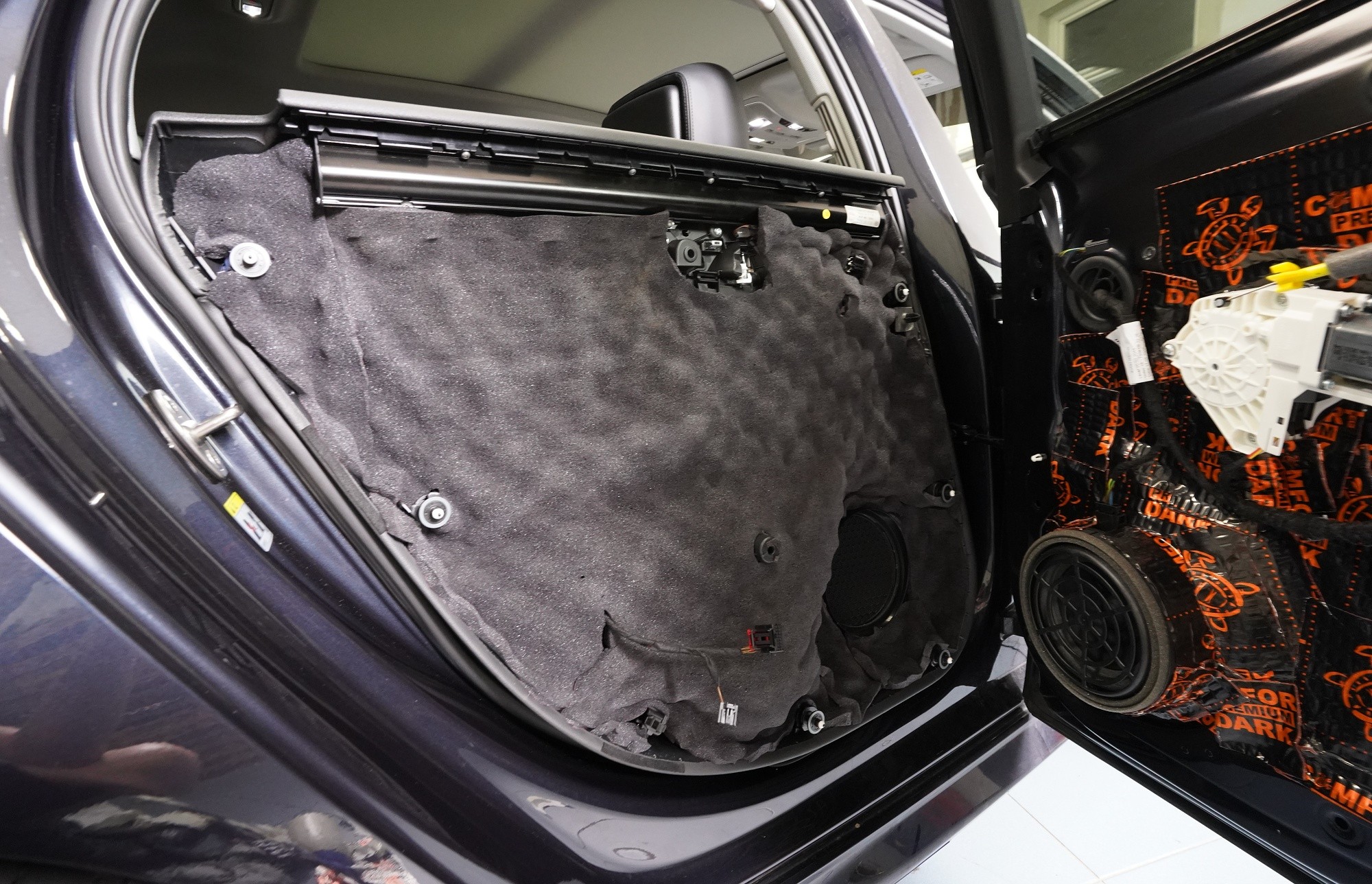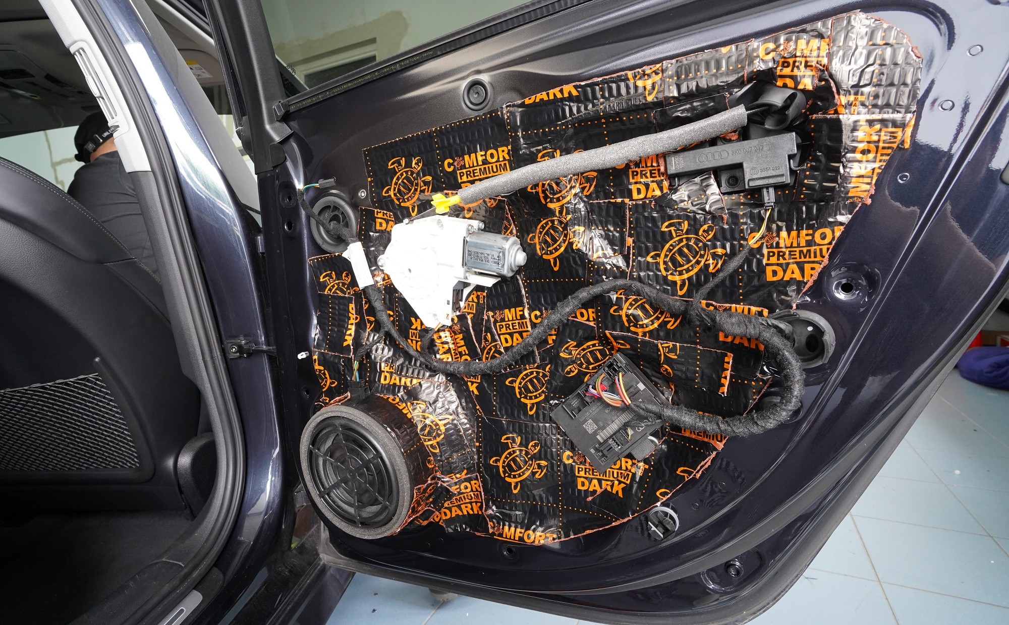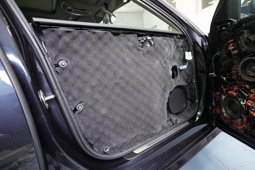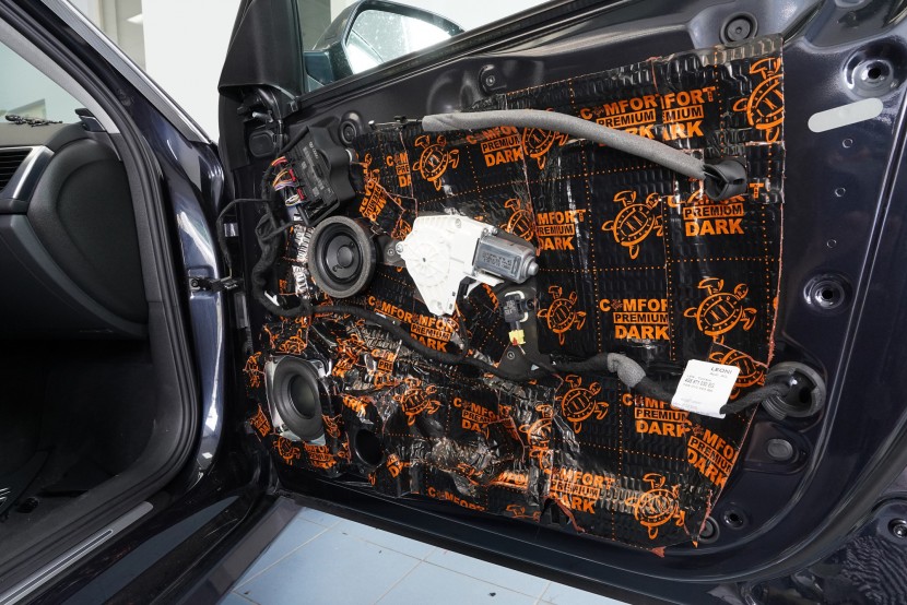 Шумоизолация на предни и задни врати на Audi A6. Ако искате да намалите шума в интериора на автомобила, подходящо решение е да започнете именно от вратите. През тях прониква голямо количество шум в интериора и качествено шумоизолираните врати значително могат да намалят шума в купето. Предните и задните врати шумоизолираме общо в 4 слоя. Първо на външния ламаринен панел прилагаме премиум виброизолационния материал Comfortmat D2 и след това шумопоглъщащия материал Comfortmat Integra, който е специално предназначен за вратите на автомобила. Този материал позволява благодарение на уникалната си антиишумна мембрана безпрецедентна способност да намали шума до -28 dB и освен това има и топлоизолационни свойства. След това отново поставяме виброизолационния материал Comfortmat D2 върху вътрешния ламаринен панел на вратата. Последната стъпка е шумоизолацията на обшивката на вратата с помощта на гъвкавата формова пяна Comfortmat Soft Wave. Тя ще предотврати разпространението на шума в тази област и ще избегне скърцане и тракане на пластмасите. Показване на продуктиСкриване на продукти