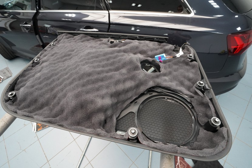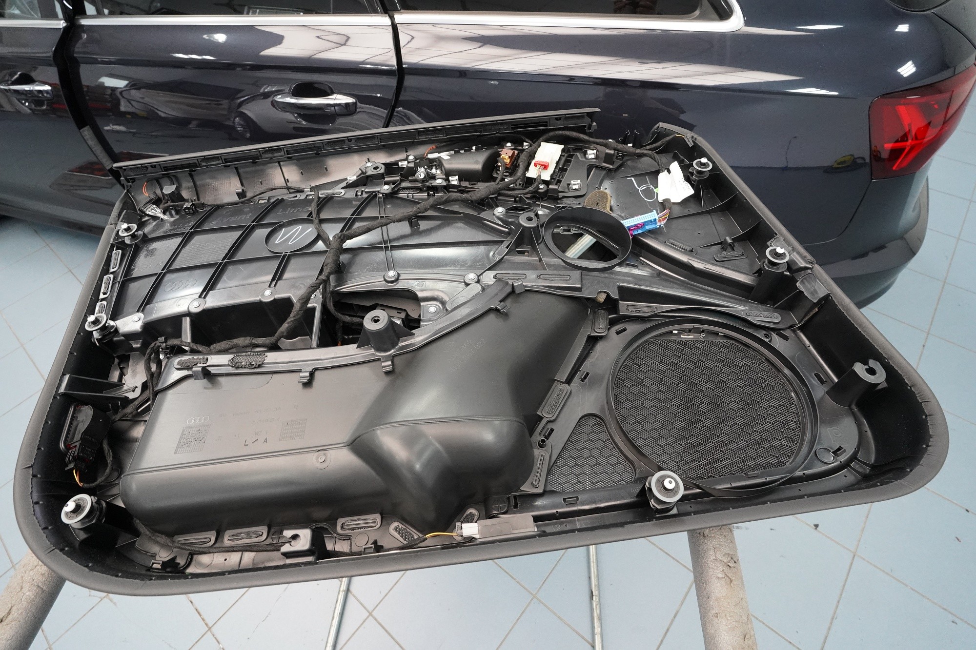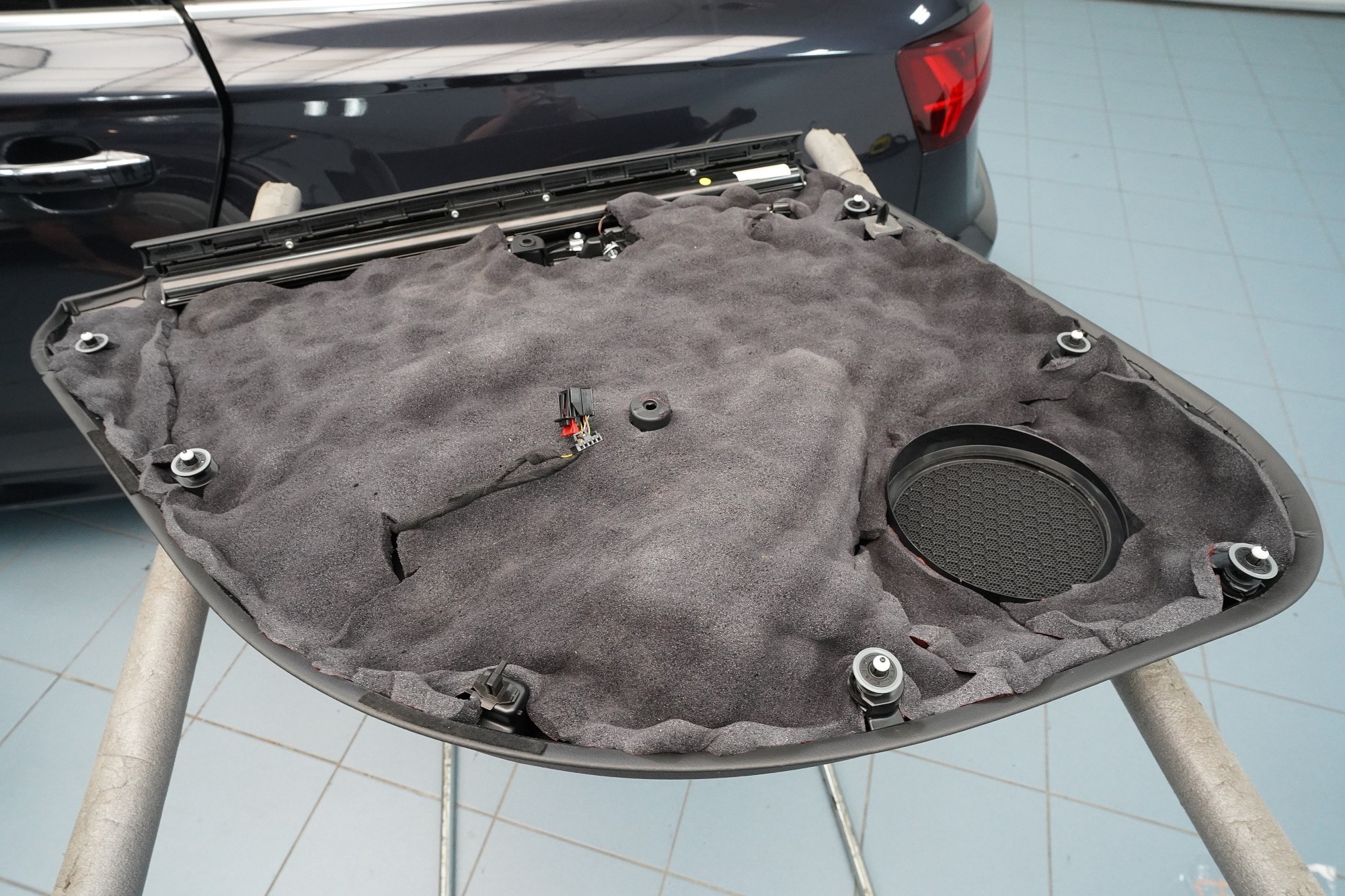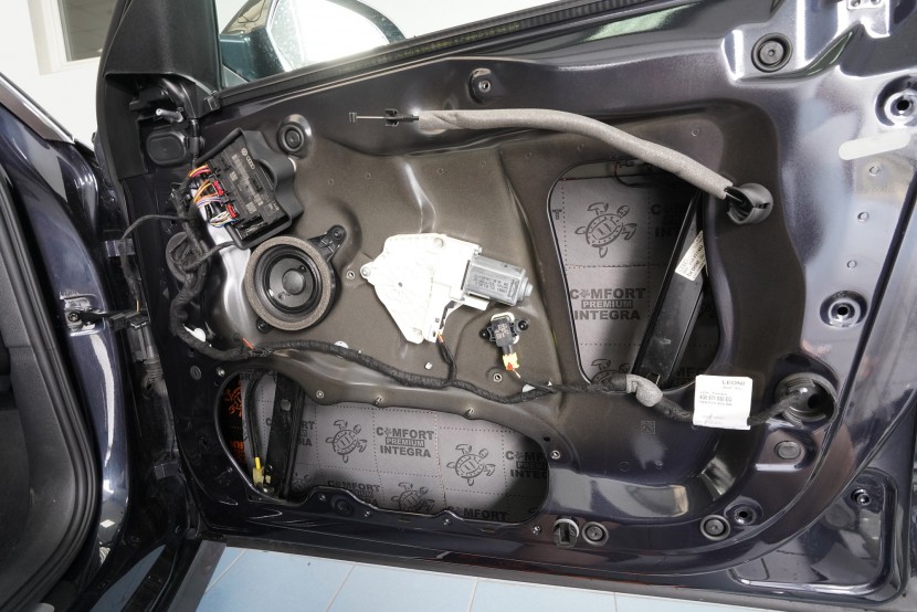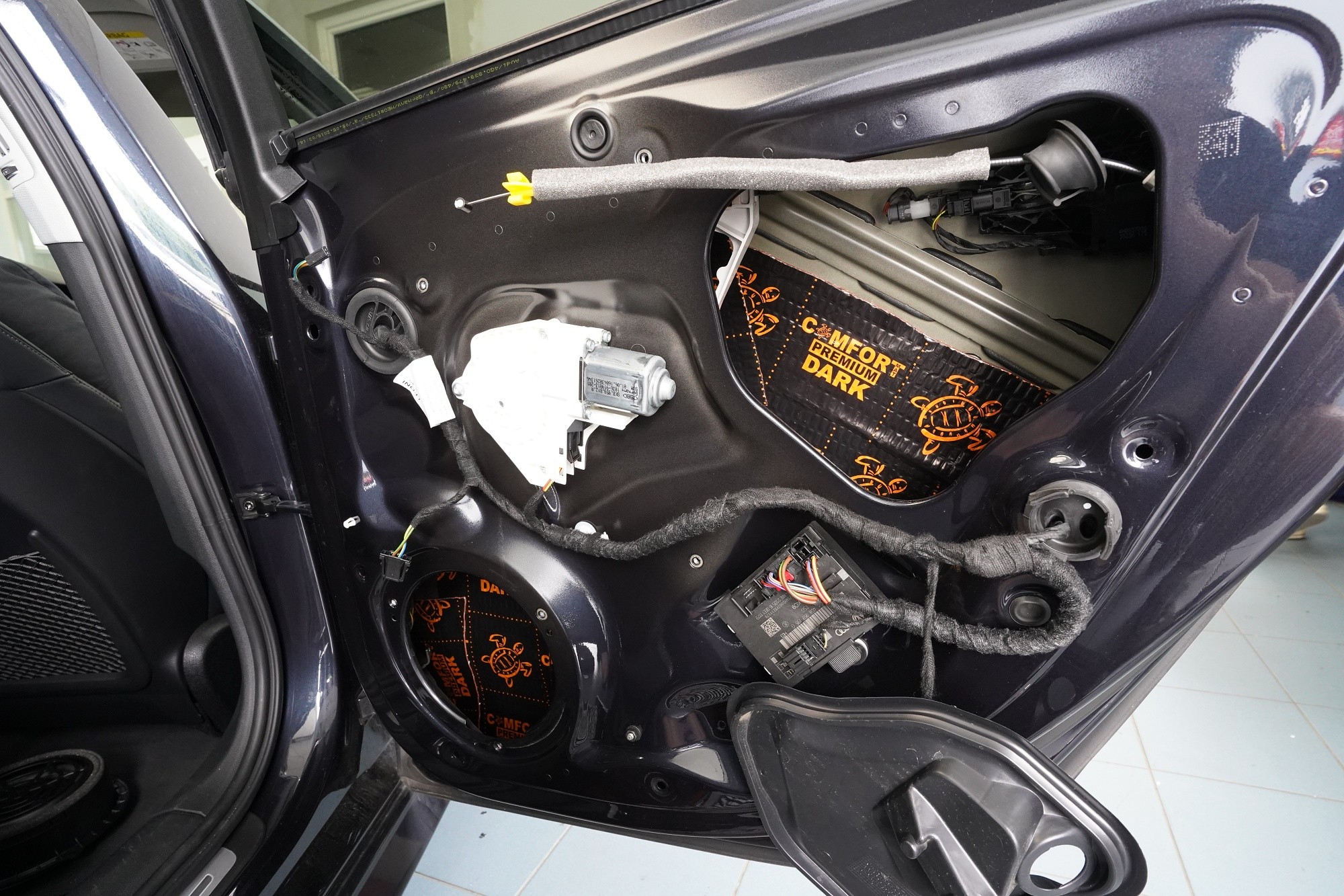 Шумоизолация на предни и задни врати на Audi A6. Ако искате да намалите шума в интериора на автомобила, подходящо решение е да започнете именно от вратите. През тях прониква голямо количество шум в интериора и качествено шумоизолираните врати значително могат да намалят шума в купето. Предните и задните врати шумоизолираме общо в 4 слоя. Първо на външния ламаринен панел прилагаме премиум виброизолационния материал Comfortmat D2 и след това шумопоглъщащия материал Comfortmat Integra, който е специално предназначен за вратите на автомобила. Този материал позволява благодарение на уникалната си антиишумна мембрана безпрецедентна способност да намали шума до -28 dB и освен това има и топлоизолационни свойства. След това отново поставяме виброизолационния материал Comfortmat D2 върху вътрешния ламаринен панел на вратата. Последната стъпка е шумоизолацията на обшивката на вратата с помощта на гъвкавата формова пяна Comfortmat Soft Wave. Тя ще предотврати разпространението на шума в тази област и ще избегне скърцане и тракане на пластмасите. Показване на продуктиСкриване на продукти