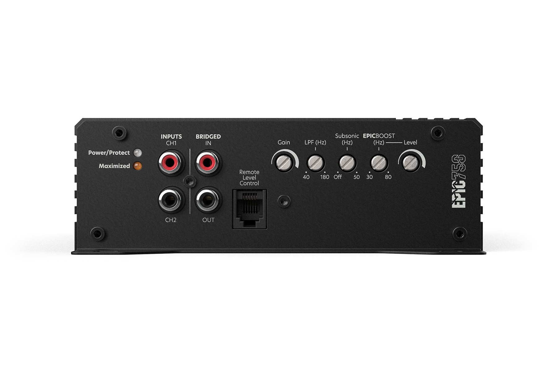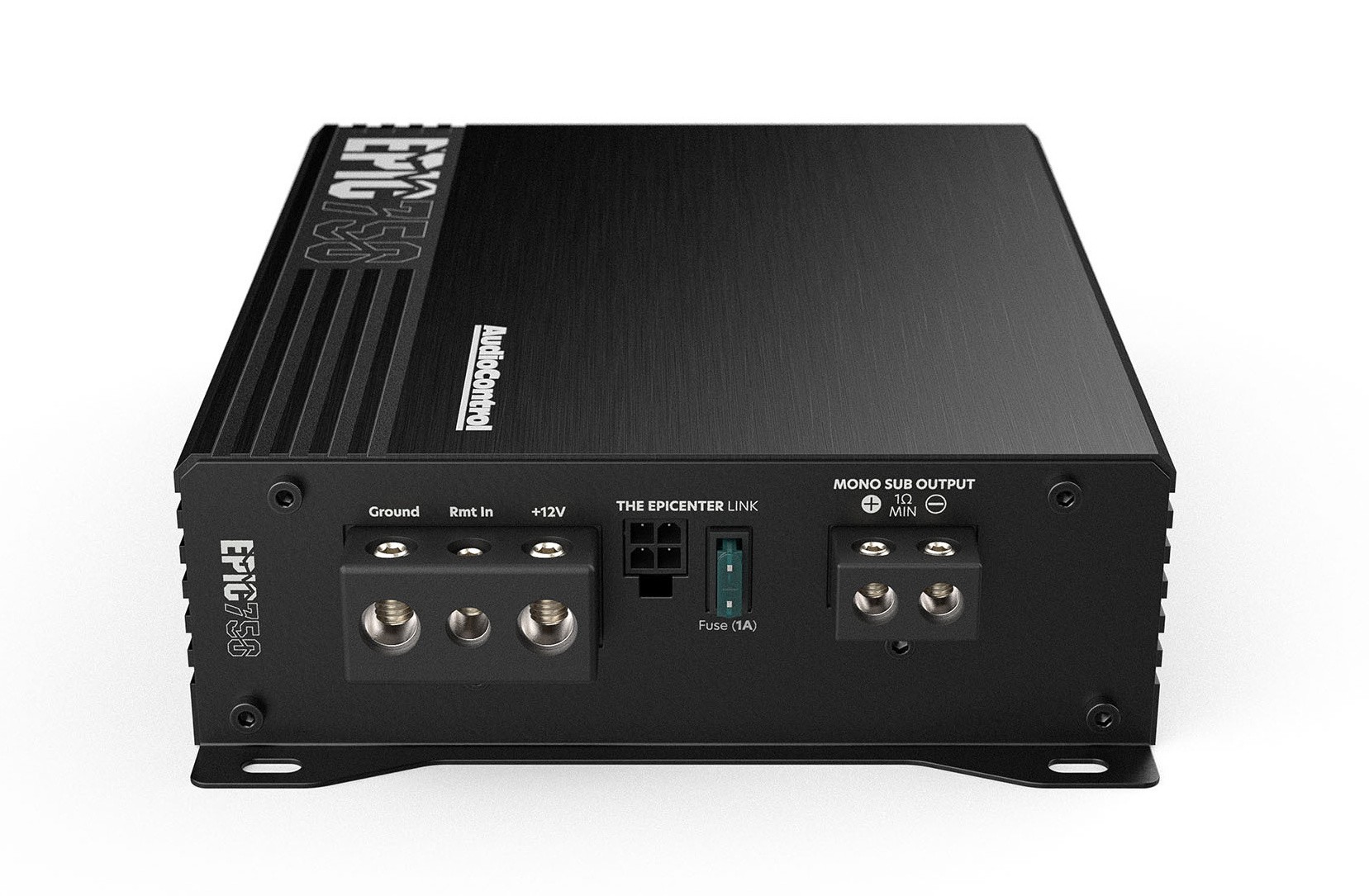Усилвателите AudioControl от серията EPIC комбинират висока мощност, компактни размери и стабилна работа при ниска импеданс. Те са проектирани за задвижване на субуфъри и мощни говорители и благодарение на цифровата технология Class-D осигуряват ефективен пренос на енергия дори при тежко натоварване. Моделът Epic750 предлага стабилност до 1 Ω, променливи филтри и възможност за настройка на усилване на басите, което позволява прецизно донастройване на нискочестотната част според нуждата. В комплекта е включен дистанционен контрол ACR-E за регулиране на нивото на баса директно от мястото на водача. Усилвателят е също така оборудван със защитни вериги срещу претоварване, пренапрежение, поднапрежение или прегряване, което гарантира надеждна и дълготрайна експлоатация. За инсталация са предвидени масивни захранващи и високоговорителни клеми с твърди винтови съединения. Epic500 може също да бъде свързан с процесора The Epicenter Bass Restoration, което разширява възможностите за настройка и басово представяне.