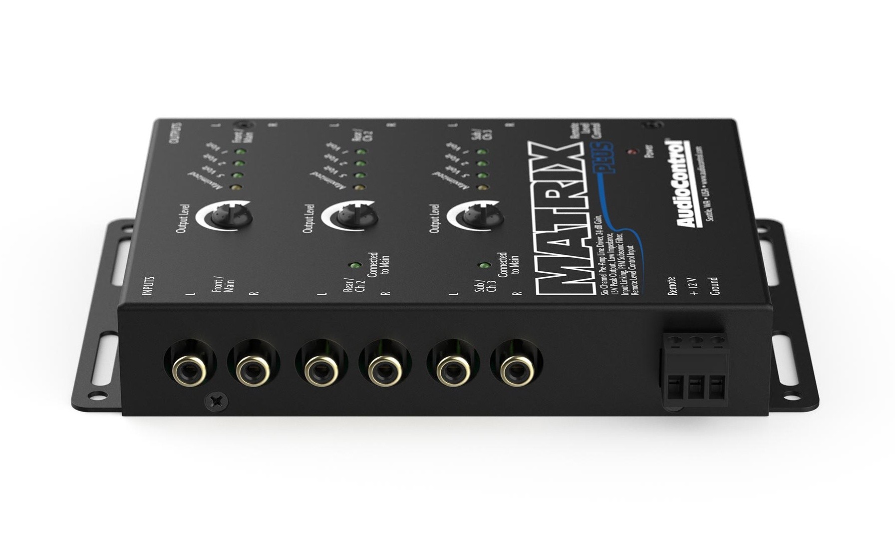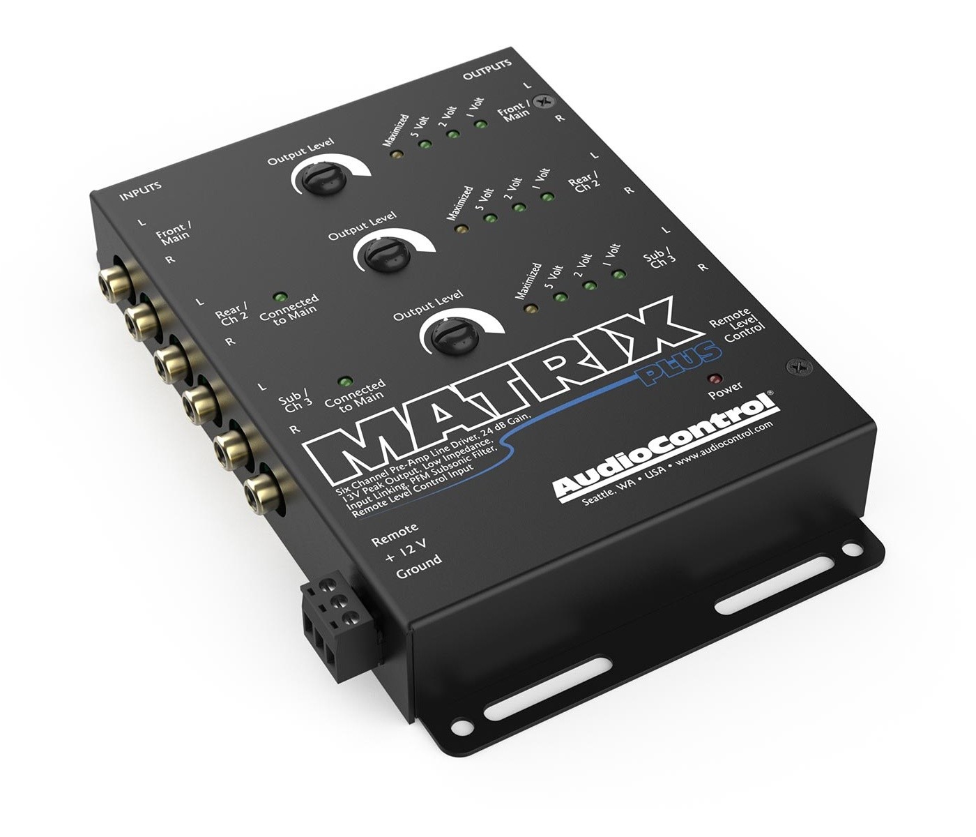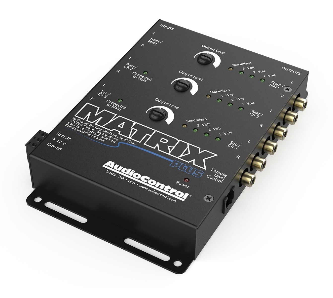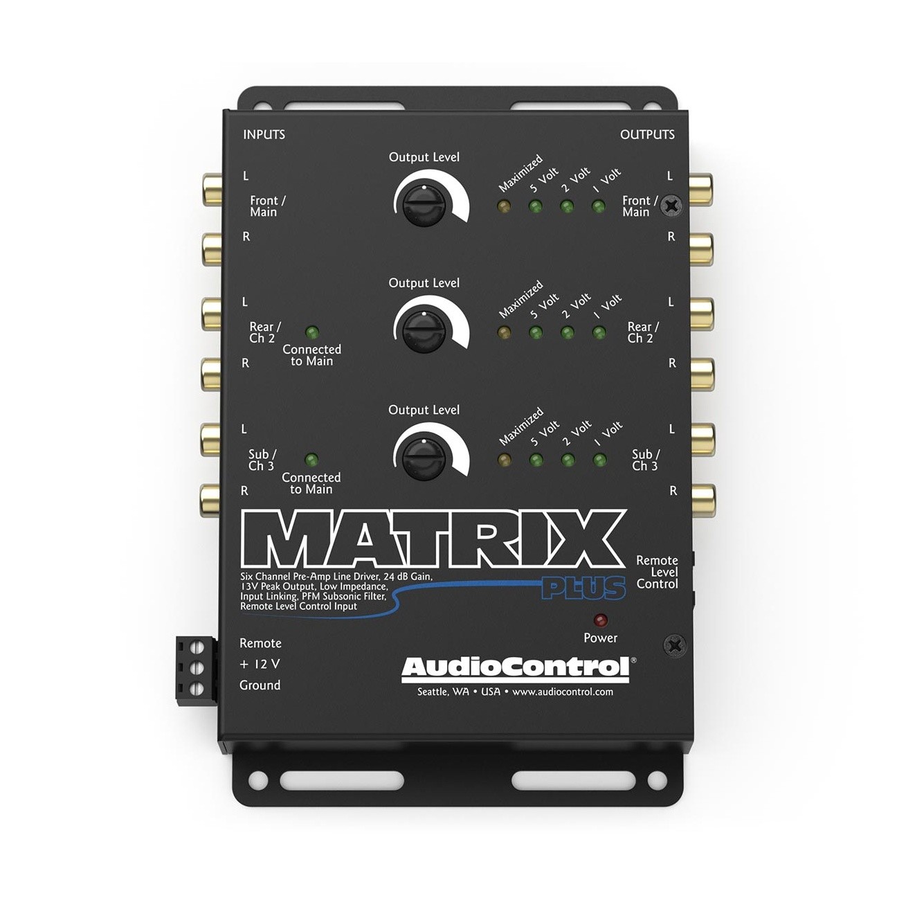 Дайте на вашата система подкрепата, от която се нуждае. Захранването на line driver-ите на AudioControl увеличава сигнала на предусилвателя до 24 dB, което осигурява по-добър динамичен обхват и тих сигнал без шум. Идеален за прокарване на дълги кабели от предната до задната част на автомобила. AudioControl създаде шестканален контролер Matrix Plus с цел да подобри звученето на аудиосистемата във вашия автомобил. Модерните автомобилни радиоапарати могат да се похвалят с много функции, но в много случаи имат сравнително ниски предусилвателни изходи, особено при ниски нива. Включете стереото на нормално ниво на силата на звука, изпратете сигнала през няколко метра кабел и усилвателите ви може да останат с много слаб звуков сигнал, което води до лошо качество на звука. Линейният контролер Matrix Plus, оборудван с усилване от 24 dB, може да повиши нивото на сигнала на предусилвателя до 9,5 V RMS/13 V пиково. При интегриране на мултимедия или управление на усилватели, Matrix Plus дава на вашата система подкрепа. С повече източници, като видео, нивото на Matrix Plus отговаря на различните нива на силата на звука, така че превключването между тях е безпроблемно. Вътрешната свързваща система Matrix позволява два входни канала да управляват всичките шест изхода и всеки изход може да управлява до седем усилвателя. Линейният контролер Matrix Plus е снабден с опционален вход за управление на таблото, който улеснява дистанционното управление на нивата на предусилвателя. Поради това AudioControl Matrix Plus е идеален контролер за общото главно ниво на системата или за нивото на субуфера. Оставете Matrix Plus да изкара вашата система на пълни обороти.