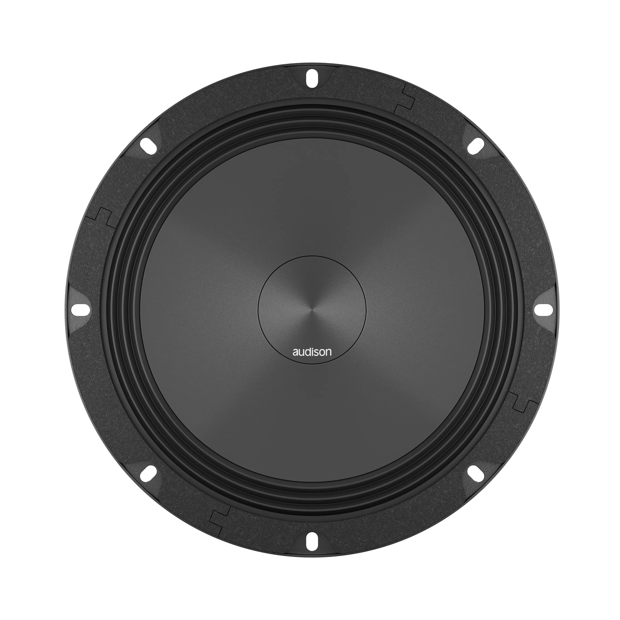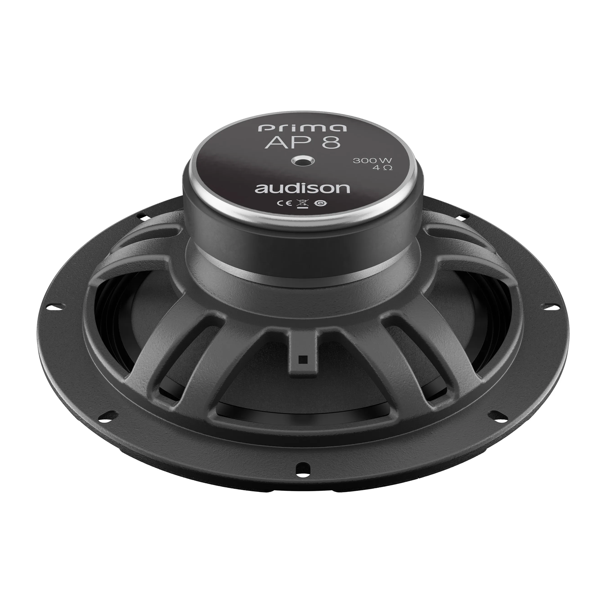 Средночестотните говорители Audison AP 8 са оборудвани с 32 мм медна бобина за максимална мощност. Хартиената мембрана с водоотблъскващо покритие е разработена с помощта на симулационната технология FEM (Finite Element Method). Намалената монтажна дълбочина позволява лесен монтаж в различни положения. Компактният корпус на говорителя е защитен с покритие против надраскване. Благодарение на терминала за бързо свързване монтажът е бърз и много гъвкав. Терминалът е снабден с пластмасов капак, устойчив на високи температури, който го предпазва от късо съединение.