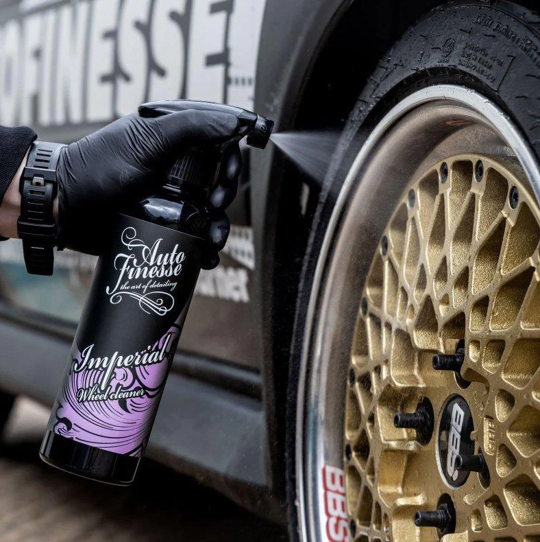 Auto Finesse Imperial Wheel Cleaner е pH неутрален почистващ препарат за джанти и гуми, който при нанасяне образува ефективна пяна. Пренебрегвани алуминиеви джанти със силно „запечен" спирачен прах са една от онези ситуации, когато автомобилният шампоан просто не е достатъчен. Затова Auto Finesse създаде почистващия препарат за джанти и гуми Imperial Wheel Cleaner, който комбинира мощен почистващ агент и обезмаслител. Imperial е некорозивен (некиселинен) почистващ препарат, подходящ за контактно миене на джантите и за отстраняване на спирачен прах и пътни замърсявания. Неговата високо пенеща формула улеснява работата и благодарение на пенливата консистенция можете да имате чисти джанти в рамките на няколко минути. Благодарение на балансираното pH е подходящ и за полиранни джанти. Както всички продукти на Auto Finesse, така и Imperial е професионален продукт, предназначен за опитни детайлъри. Благодарение на високата ефективност и лесната употреба, дори начинаещ ще постигне отлични резултати с този препарат.