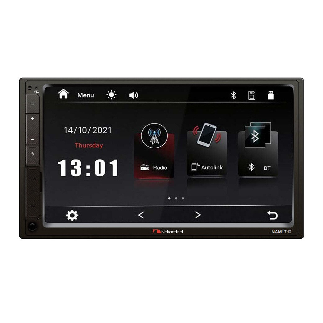 Nakamichi NAM1712 е безмеханично авторадио с размер 2DIN, което разполага със 7" сензорен дисплей. На предния и задния панел има USB вход, чрез който можете да възпроизвеждате любима музика или мултимедия. Разбира се има и Bluetooth за безопасни разговори и стрийминг на музика. Микрофонът при този модел е вграден, но е възможно да се свърже и външен микрофон. Цветът на бутоните може да се избира според предпочитания благодарение на променливото подсветяване, в комплекта е включено и дистанционно управление, а 3-те двойки RCA изходи (4 V) за усилвател ще зарадват всеки ентусиаст. Насочеността към по-високо качество на звука личи и благодарение на вградения DSP процесор, на който можете да настроите и времеви корекции или 16-лентов еквалайзер.Най-интересни характеристики на авторадиото Nakamichi NAM1712