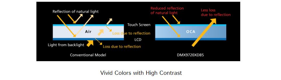 Между сензорния панел и LCD екрана е добавено оптично прозрачно лепило (OCA), което премахва въздушния слой и потиска отраженията и отблясъците. Тази функция увеличава контраста и яркостта и поддържа по-добра видимост на дисплея в различни условия.