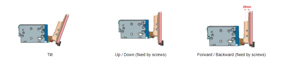 Здравият плаващ механизъм на дисплея генерира по-малко вибрации дори при неравен път. Може да се инсталира независимо от размера на панелния отвор. Освен това позицията на дисплея може да се регулира по следните три начина, което позволява да поставите големия екран в много повече превозни средства.