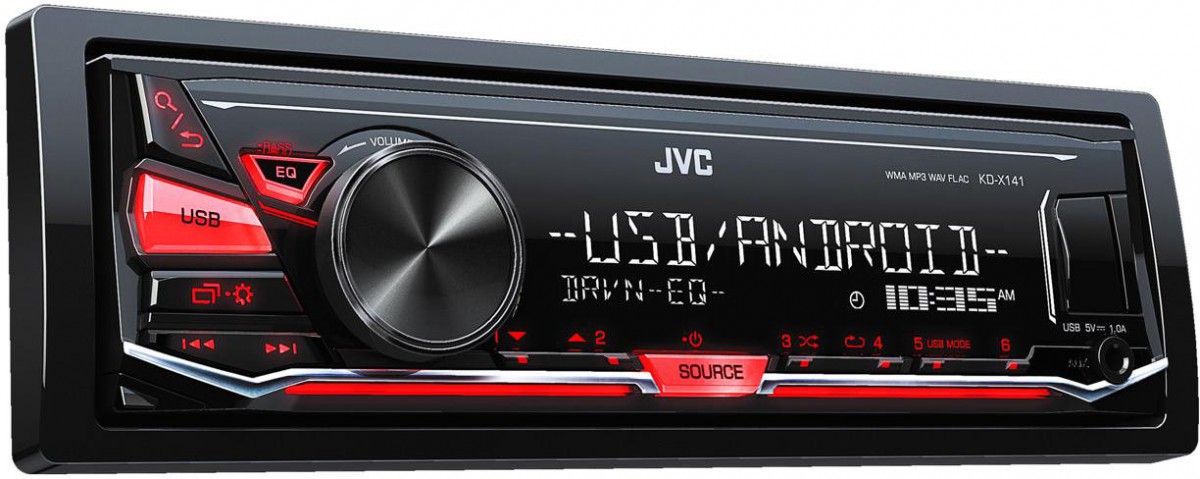 Безмеханична автомагнитола JVC с FM/AM тунер и функция RDS, където освен слушане на радио можете да използвате и предния USB вход за възпроизвеждане на музика, както и за зареждане на мобилен телефон (макс. 1 A). Други музикални източници могат да се свържат и към предния AUX вход, а също така има и 1 RCA изход (2,5 V). Подходящ изход за звук осигурява вграденият MOS-FET усилвател с мощност 4 x 50 W, а базовото настройване на звука според вкуса на всеки слушател позволява параметричен 3-полосен еквалайзер с тринадесет предварително зададени режими. Магнитолата поддържа формати MP3, WMA, WAV и дори FLAC. Двуредовият бяло подсветен текстов дисплей отлично се допълва от бутони с червено подсветяване. За да не загубите тази автомагнитола, предният панел може да бъде свален, което предотвратява кражба.