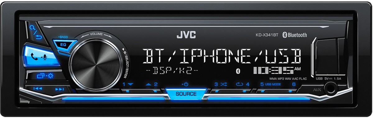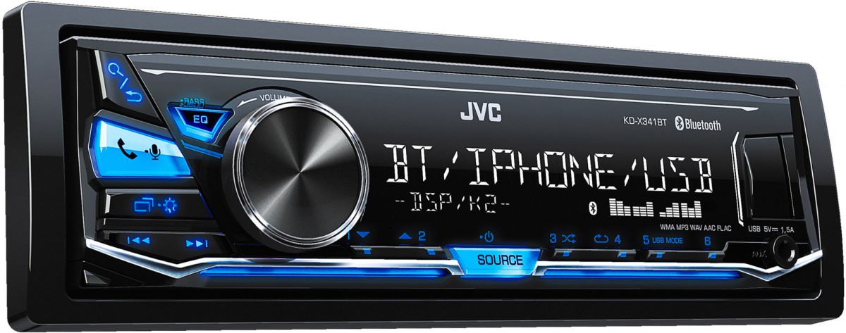 Безмеханична автомагнитола с Bluetooth JVC KD-X341BT, която предлага FM и AM тунер, преден USB вход с възможност за зареждане на смартфон (макс. 1,5 A), преден AUX вход или един чифт RCA изходи. Качественият звуков изход осигурява вграденият MOS-FET усилвател с мощност 4 x 50 W, а настройването на звука според вкуса на всеки слушател позволява параметричен 13-полосен еквалайзер с девет предварително зададени режими. Магнитолата лесно се справя с формати MP3, WMA, WAV и FLAC. Функцията Bluetooth можете да използвате за удобно сдвояване с вашия телефон с поддръжка за Android и iOS за възпроизвеждане на музика или за телефонни разговори. Магнитолата може да свърже едновременно две мобилни устройства. Двуредовият бяло подсветен текстов дисплей приятно се допълва от бутони с синя подсветка. За да не изгубите тази маркова автомагнитола, предният панел може да се извади и така да се предотврати евентуална кражба.