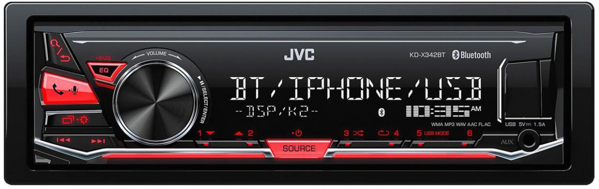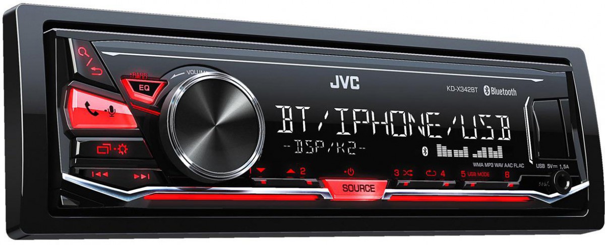 Безмеханична автомагнитола с Bluetooth JVC KD-X342BT, която предлага FM и AM тунер, преден USB вход с възможност за зареждане на смартфон (макс. 1,5 A), преден AUX вход или един чифт RCA изходи. Качественият звуков изход осигурява вграденият MOS-FET усилвател с мощност 4 x 50 W, а настройването на звука според вкуса на всеки слушател позволява параметричен 13-полосен еквалайзер с девет предварително зададени режими. Магнитолата лесно се справя с формати MP3, WMA, WAV и FLAC. Функцията Bluetooth можете да използвате за удобно сдвояване с вашия телефон с поддръжка за Android и iOS за възпроизвеждане на музика или за телефонни разговори. Магнитолата може да свърже едновременно две мобилни устройства. Двуредовият бяло подсветен текстов дисплей приятно се допълва от бутони с синя подсветка. За да не изгубите тази маркова автомагнитола, предният панел може да се извади и така да се предотврати евентуална кражба.