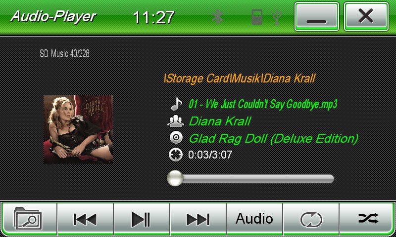 - Поддръжка на Bluetooth handsfree включително зареждане на телефонния указател и безжично възпроизвеждане на музика чрез A2DP