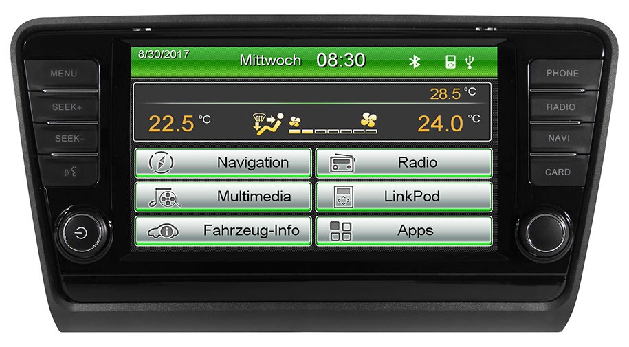 - Поддръжка на връзка с дисплей MDF, оригинални парктроници и climatronic