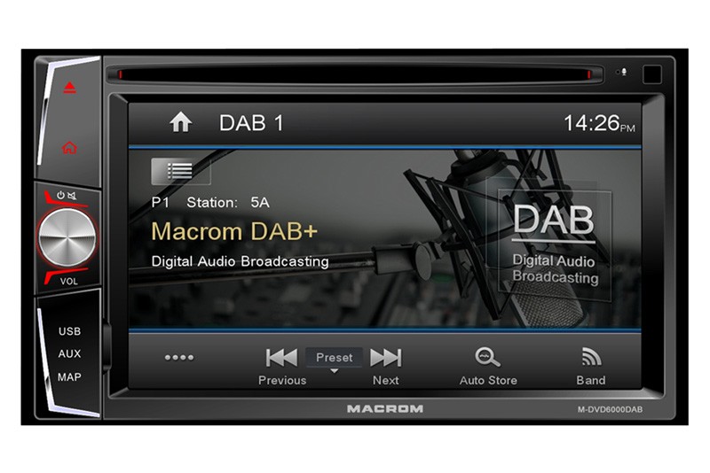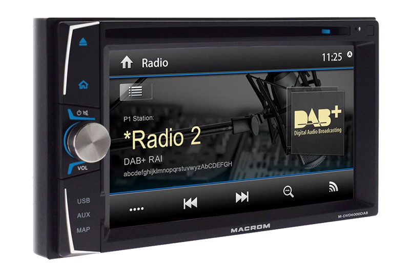 Macrom M-DVD6000DAB е мултимедийно устройство с DAB радиоприемник, вградена GPS навигация, вградена CD / DVD механика, преден и заден USB вход и SD четец за памет карти. Устройството е оборудвано с 6,2" сензорен монитор, вход за камера за обратно виждане (при включване на задна предавка) и вход за управление от волана. Macrom M-DVD6000DAB включва handsfree комплект с външен микрофон. С помощта на 2DIN монтажна рамка може да бъде поставено в повечето видове автомобили.