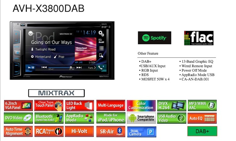 2DIN автомагнитола Pioneer, която освен обичайните функции има и вграден модул за приемане на DAB+ радио. DAB+ антена не е включена в комплекта. Насладете се на любимото си съдържание на големия 6,2" сензорен дисплей директно на таблото. Лесно свързване към смартфон iPhone или Android чрез USB кабел, за да можете удобно да управлявате приложенията директно от главния панел. Автомагнитола Pioneer AVH-X3800DAB възпроизвежда съдържание от CD, DVD дискове и USB устройства. Тя също така има вграден DAB+ тунер за слушане на радиостанции в цифрово качество без изкривяване на звука. Тази автомагнитола позволява присъединяване на две Bluetooth устройства едновременно за безжично стриймване на музика или hands-free разговори. Сред другите удобни функции са 13-лентов графичен еквалайзер и функцията MIXTRAX EZ, благодарение на която можете да се наслаждавате на любимите си хитове в непрекъснат микс с DJ-ефекти.