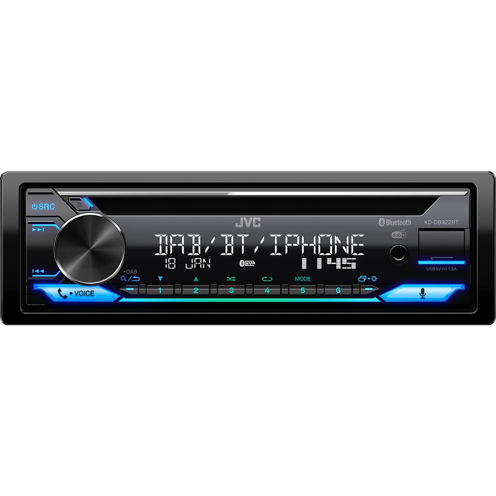 Автомагнитола с CD плейър KD-DB922BT от JVC с интегрирана Bluetooth технология за hands-free повиквания и безжично стриймване на музика и вграден DAB тунер за прием на цифрово излъчване. Доставя се с приложението JVC Remote, благодарение на което автомагнитолата може да се управлява чрез приложение на смартфон. Големият и лесно четим LCD дисплей ясно показва всички данни в комбинация с променлива цветна подсветка на клавишите за лесно управление. Мощният усилвател 4 x 50 W увеличава мощността на вашите говорители. Ако искате да добавите външни усилватели, са налични три 2,5 V изхода. Качеството на звука е гарантирано чрез напълно цифрова обработка на звука и времеви корекции заедно с 13-полосен графичен еквалайзер.Основни характеристики