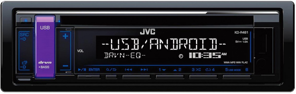 Автомагнитола с CD JVC KD-R481 е оборудвана с FM тунер и памет за запаметяване на радиостанции и естествено поддържа RDS. Освен слушането на радио, можете да възпроизвеждате и вашите музикални CD-R/CD-RW с поддръжка на MP3/WMA/WAV и FLAC файлове. Предимство на този модел е предният USB, благодарение на който можете да пускате музика от USB диск. Защитете се от кражба на паркинг, пред къщата и навсякъде, където е необходимо да оставите автомобила без надзор. Предният панел може лесно и бързо да се свали, за да се намали възможността за отмъкване на радиото от паркиран автомобил. Качественият звуков изход се осигурява от вграден MOS-FET усилвател с мощност 4 x 50 W, 24-битов D/A преобразувател, а настройката на звука според вкуса на слушателя е възможна чрез 3-лентов еквалайзер и 13 предварително зададени пресета.